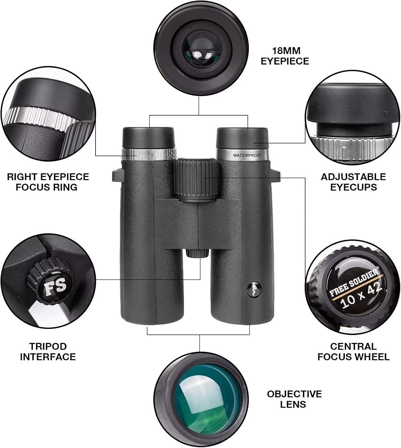 【Professional Binoculars】10X power magnification (optimal magnification), 42mm large objective lens, large field of view good for fast moving subject, high clarity and brightness, perfect for bird watching, hunting, travel, opera, concert, sports games, safari.