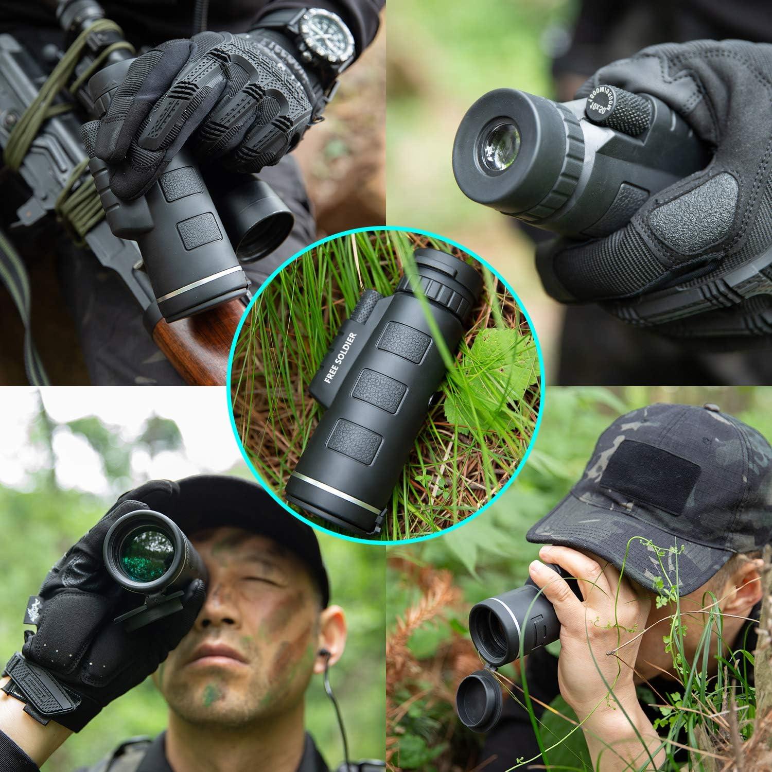 【Powerful Monocular】FREE SOLDIER monocular provides 10xmagnification, and the large 42mm objective lens brings you a wide field of view. As a hunting monocular for adults, it is a powerful assistant in your outdoor activities, perfect for hunting, bird watching, hiking, camping, traveling, and so on.