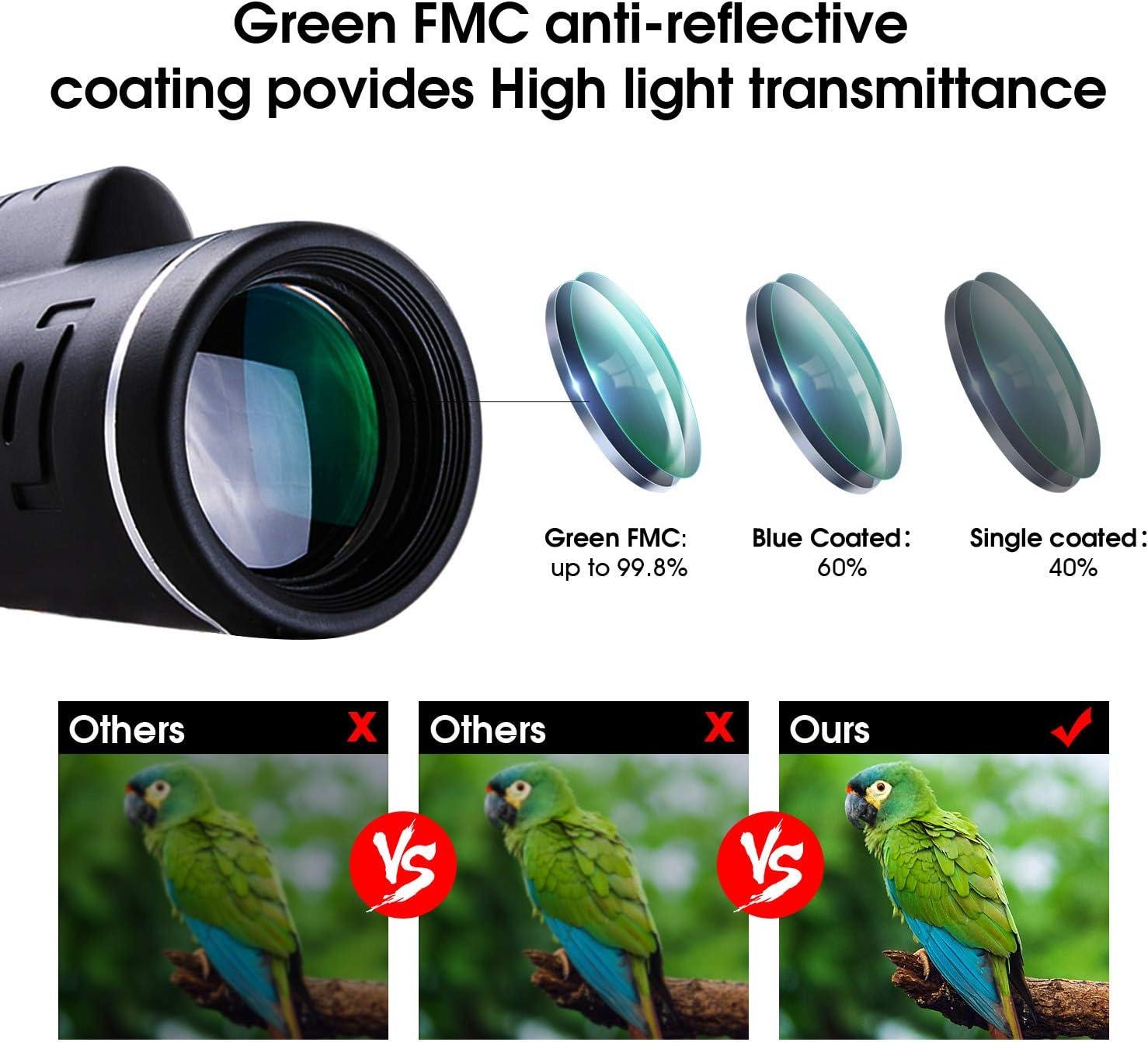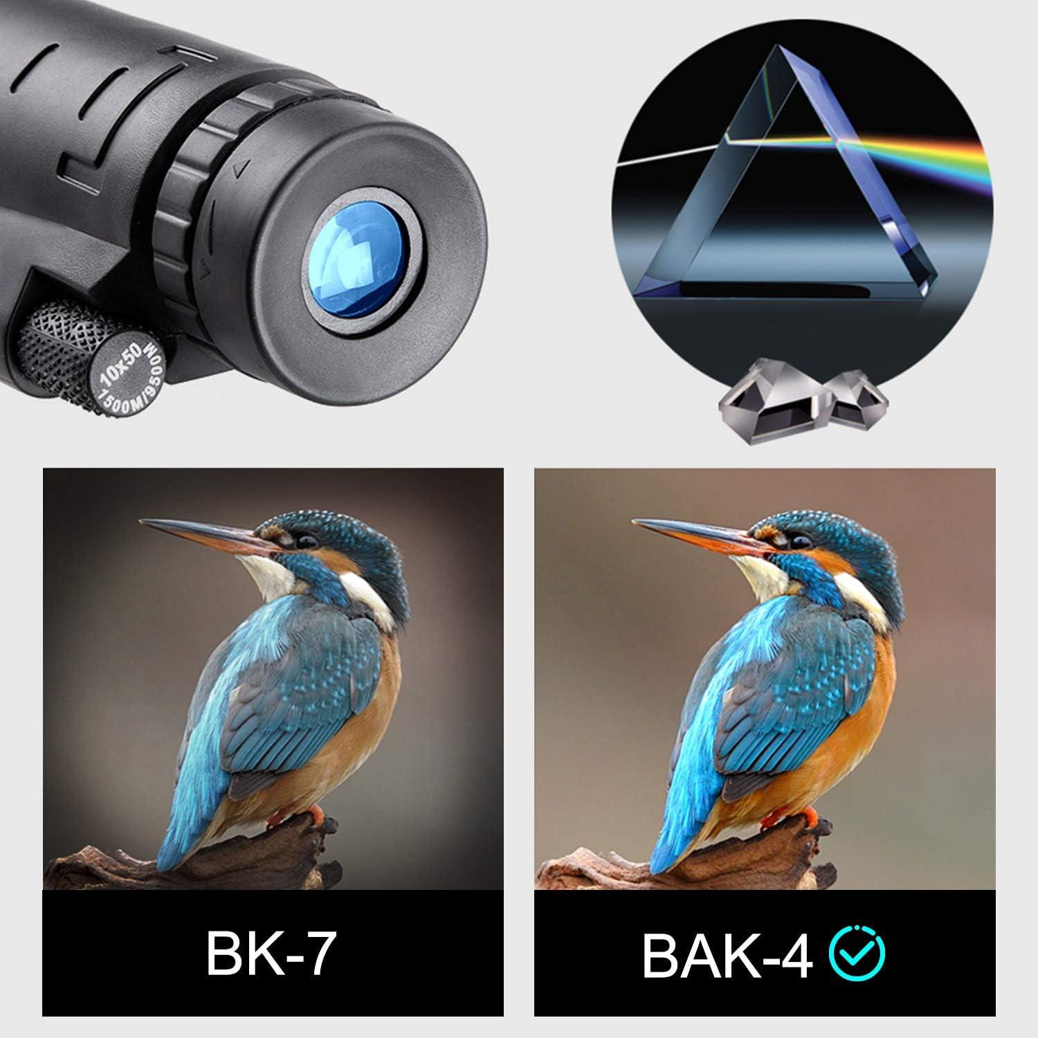 【Professional Monocular Telescope】 This monocular telescope adopts multi-layer lenses (double-layer objective lens, three-layer eyepiece lens) and FMC process to ensure 99.9% light transmittance and imaging authenticity. The built-in Bak4 prism eliminates ghost images and makes the image clearer. Use this monoculars to explore what you want to observe in the weak light.