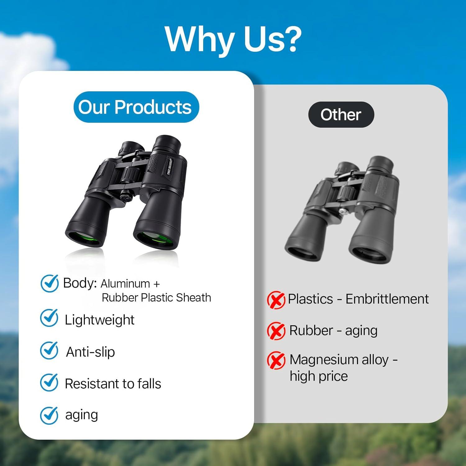 Powerful Binoculars: The binoculars for adults have 20X power magnification, 50mm large objective lens, large field of view of 1000 yards, making them good for fast-moving subjects. They are easy to operate binoculars for adults and kids, perfect binoculars for bird watching, hunting, travel, opera, concert, sports games, safari