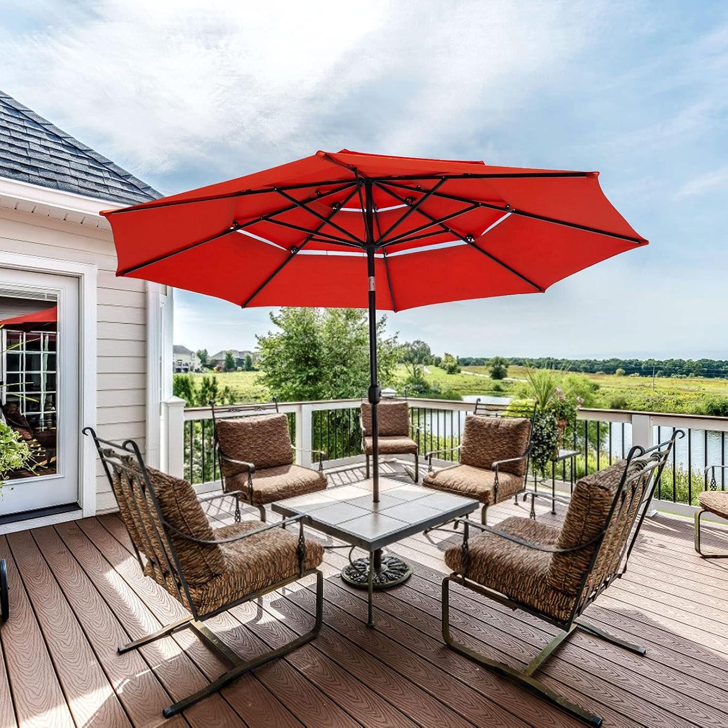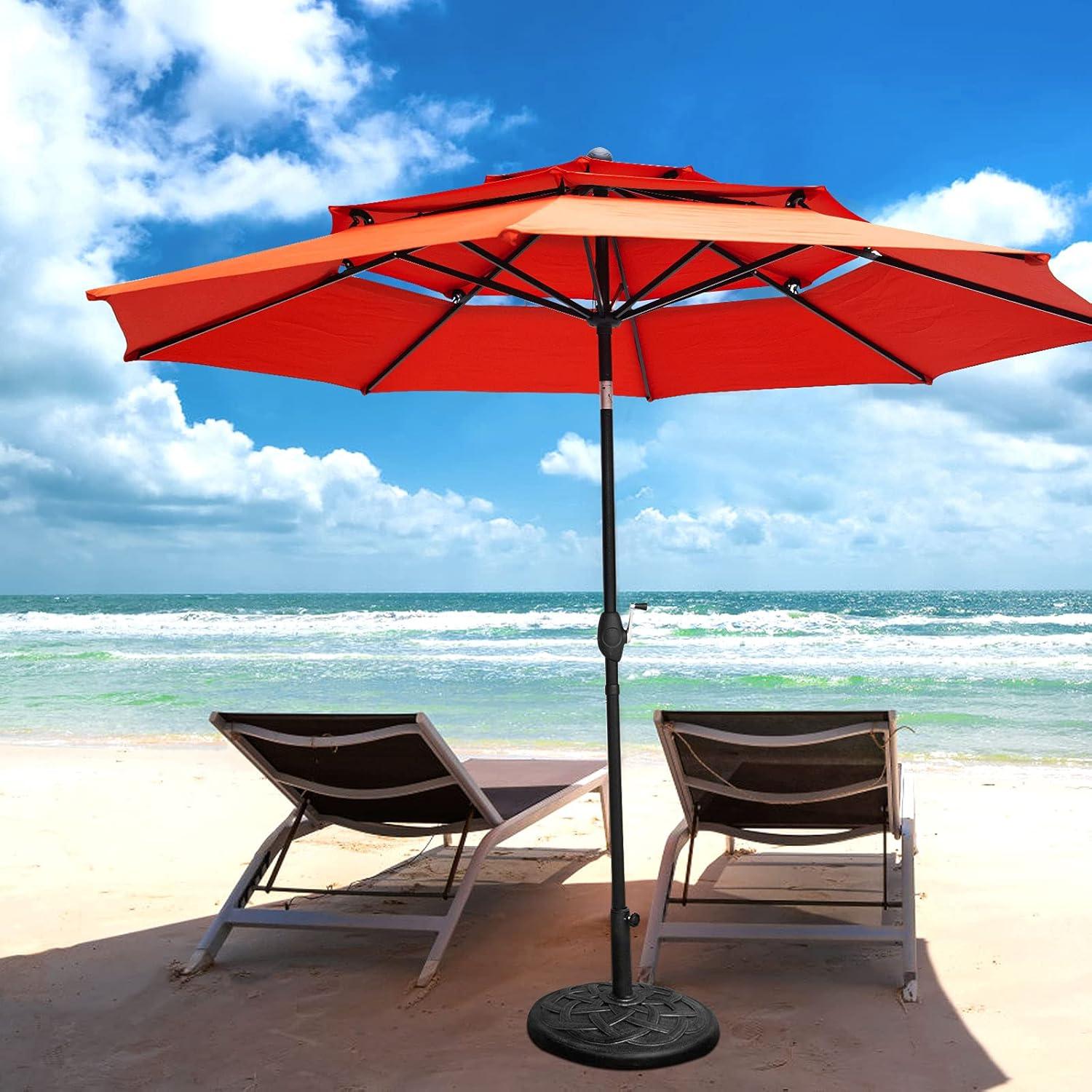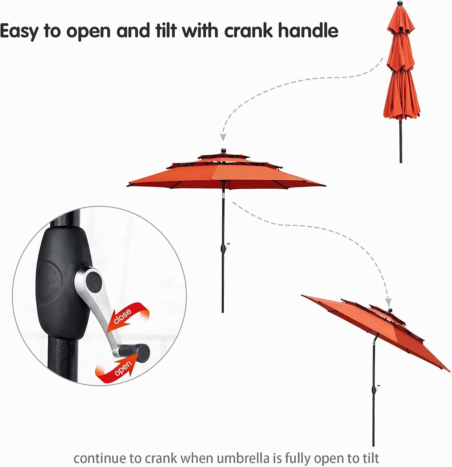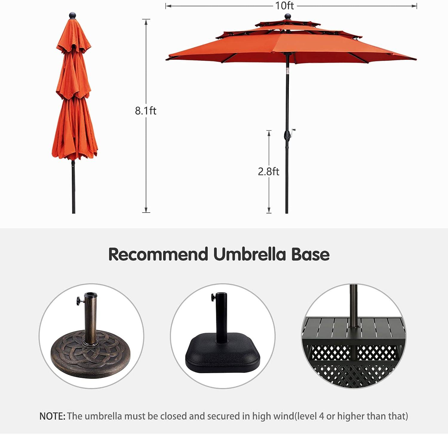 3 TIER BREATHABLE DESIGN: The patio table umbrella with 3 tiers and open top for great air circulation. Hot air or wind will flow through the opening quickly for better cooling underneath the shading area. The opening on the top also helps with stabilizing the outdoor umbrella in windy outdoor situations. Enjoy your outdoor time every sunny day