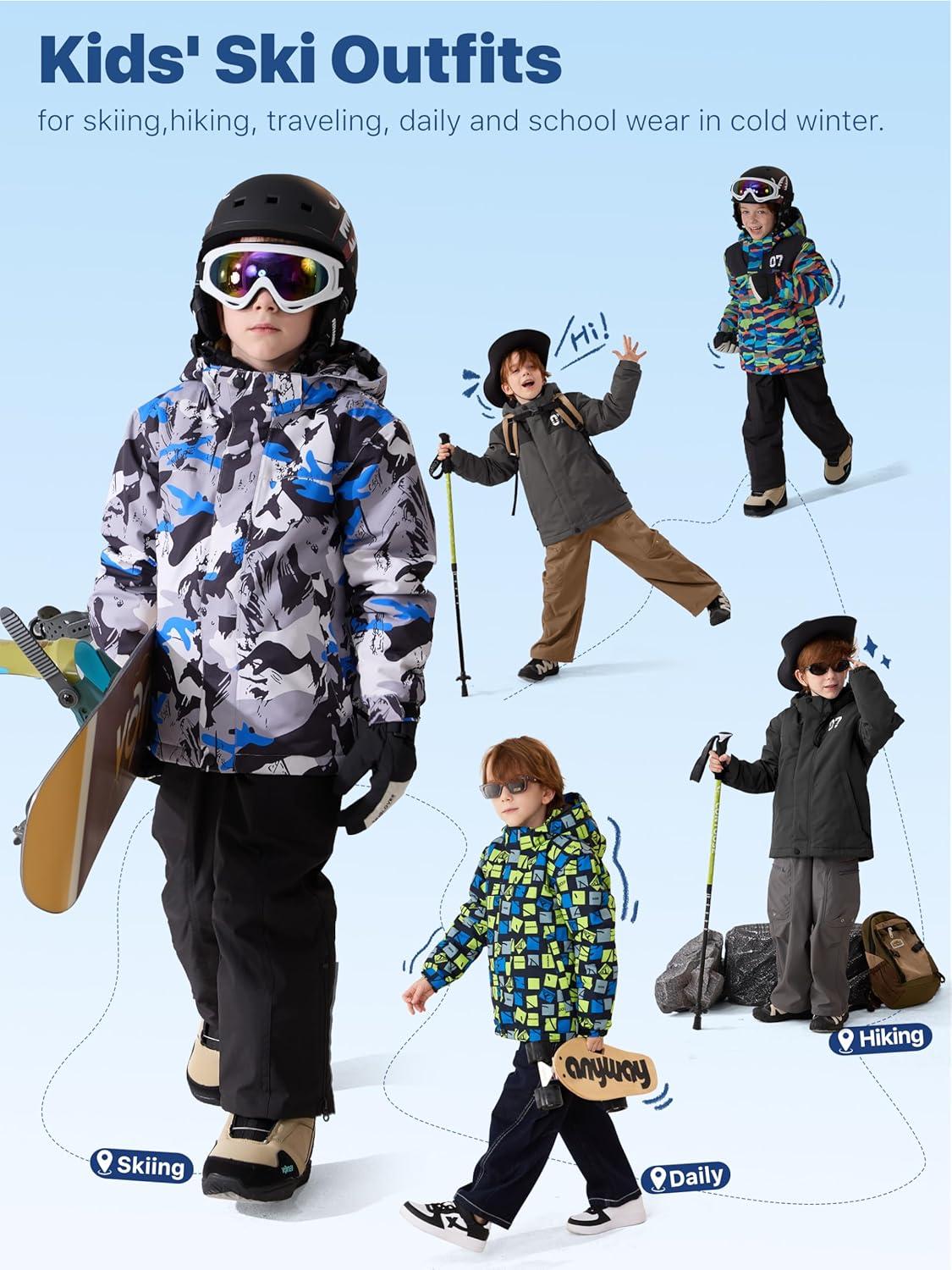 FREE SOLDIER Boys Girls Waterproof Ski Jacket Fleece Lined Warm Winter Snow Coat Kids Winter Jacket with Detachable Hood(Summit Stripe)