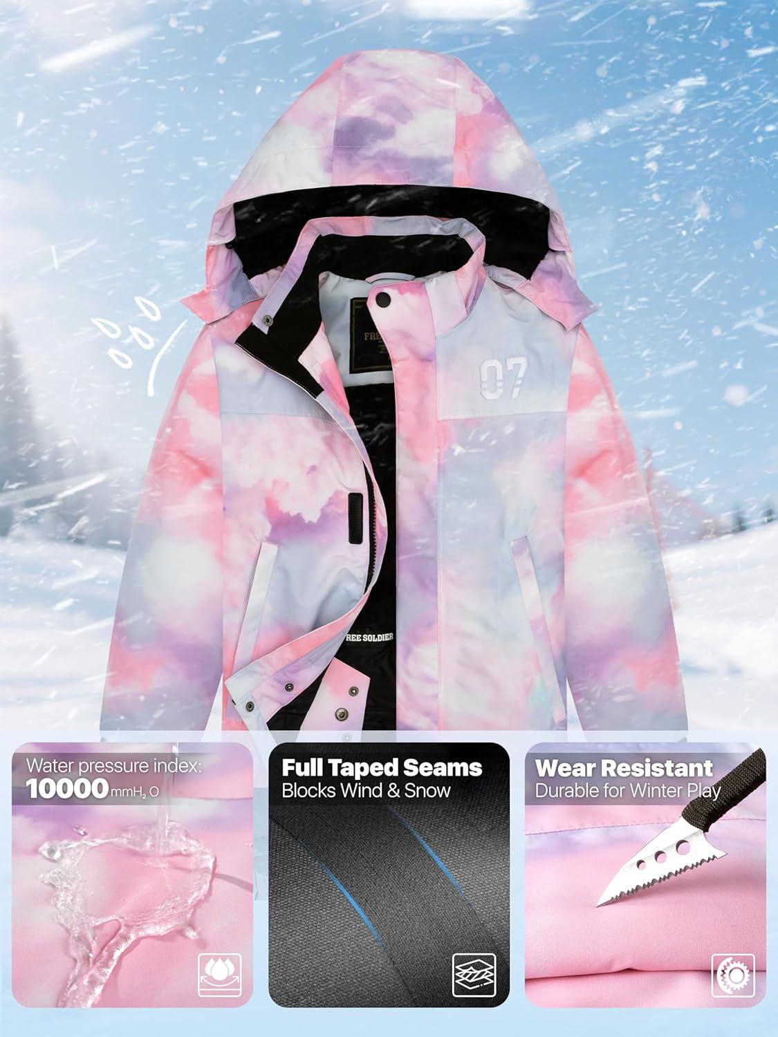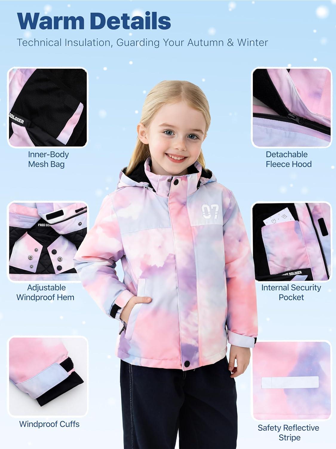 FREE SOLDIER Boys Girls Waterproof Ski Jacket Fleece Lined Warm Winter Snow Coat Kids Winter Jacket with Detachable Hood(Pinkish Purple)