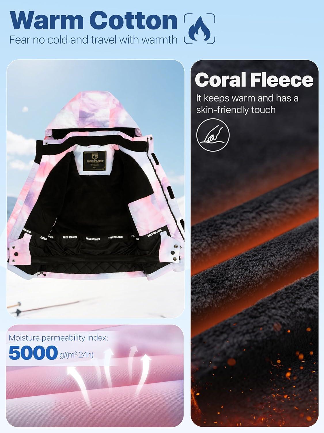 FREE SOLDIER Boys Girls Waterproof Ski Jacket Fleece Lined Warm Winter Snow Coat Kids Winter Jacket with Detachable Hood(Coral Pink)