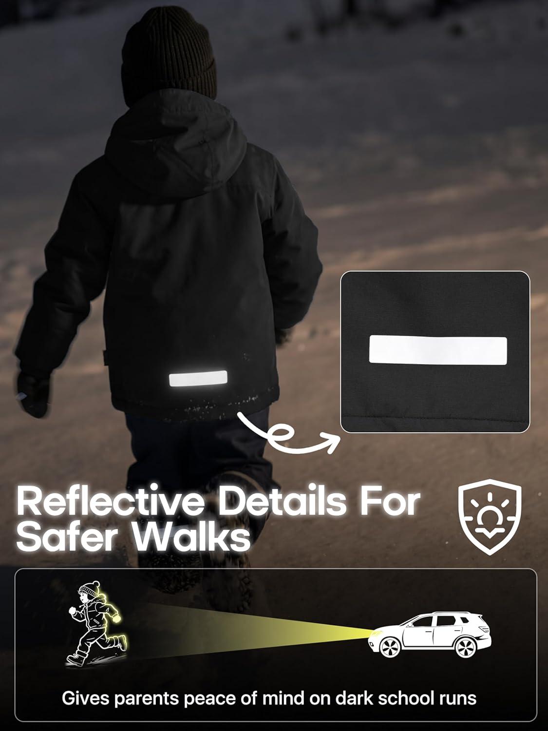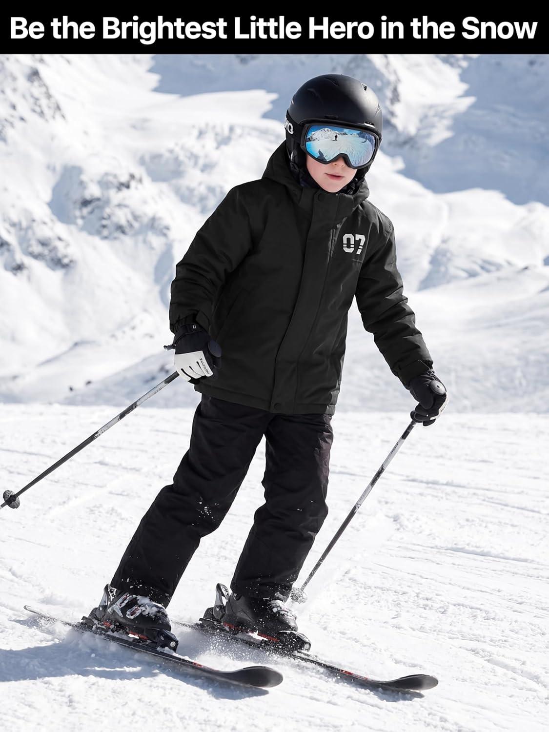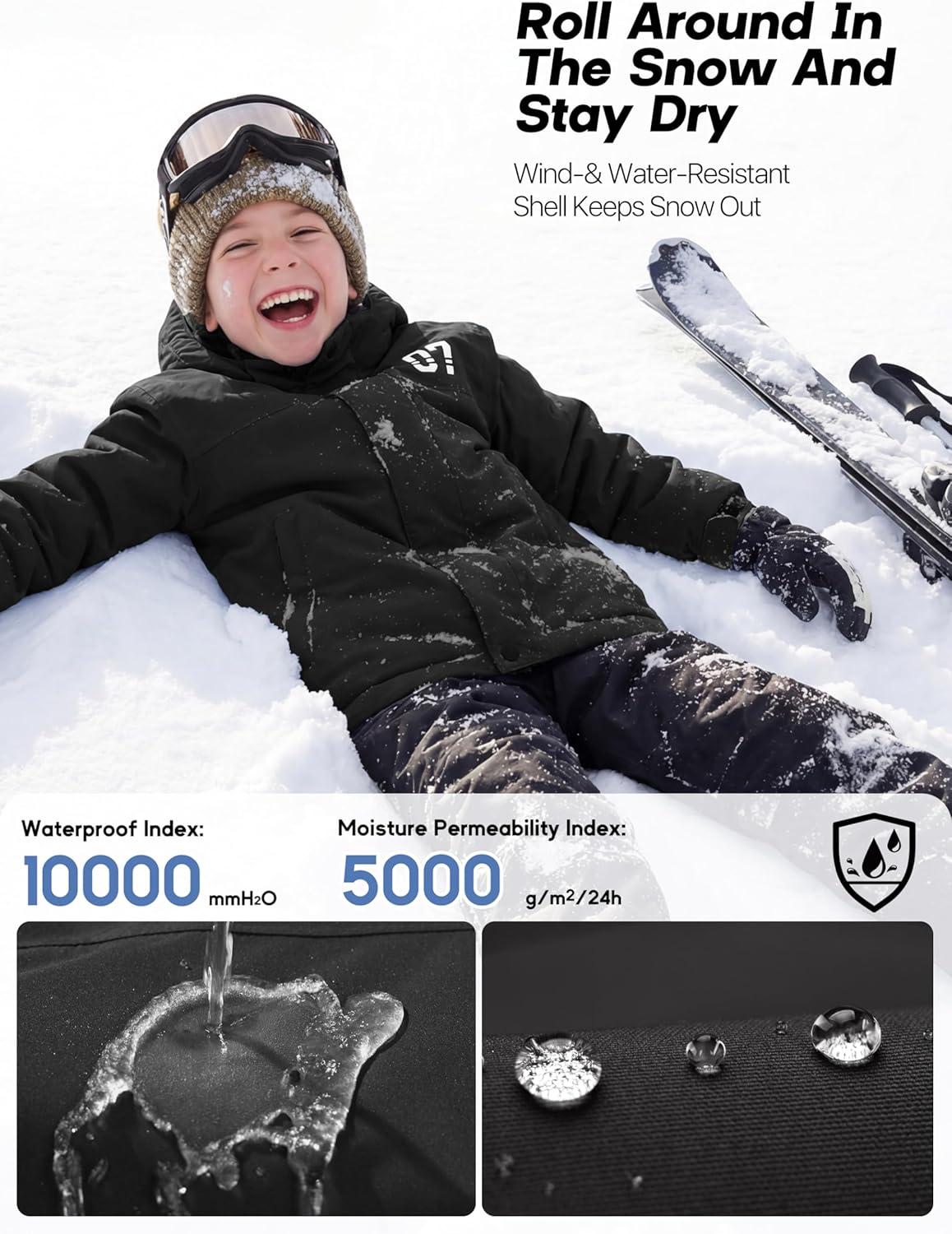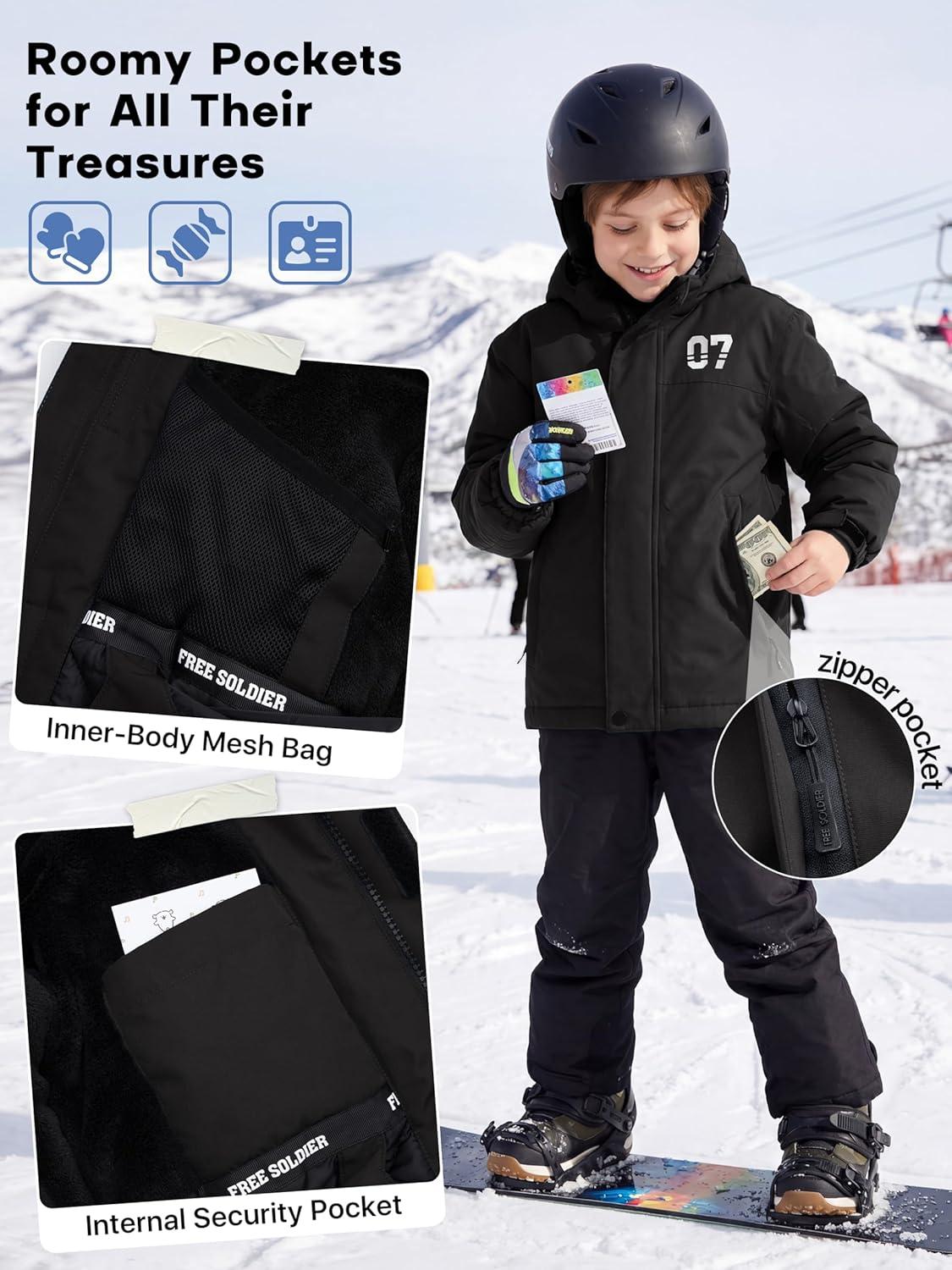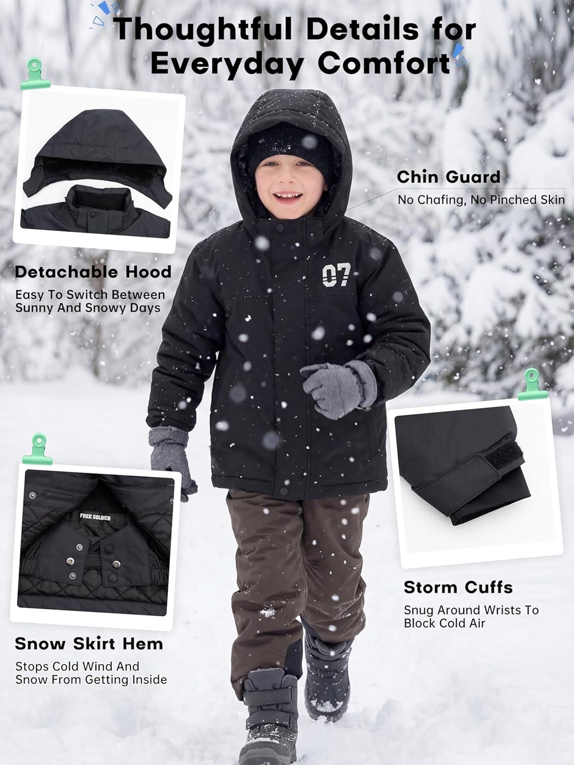 FREE SOLDIER Boy’s Waterproof Warm Ski Jacket Windproof Fleece Thick Kids Winter Coat with Hood for Snowboarding Outdoor(Deep Black)
