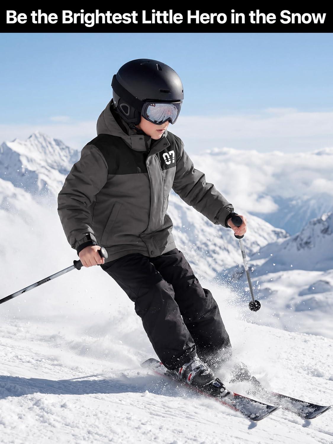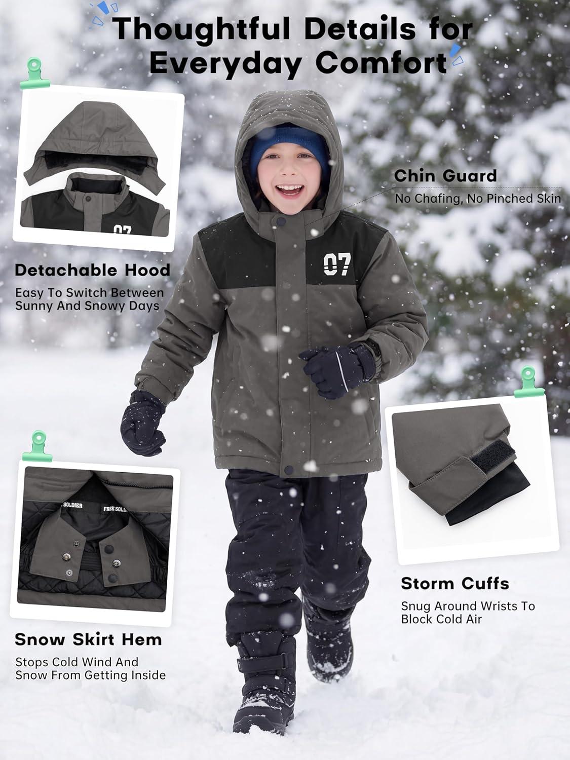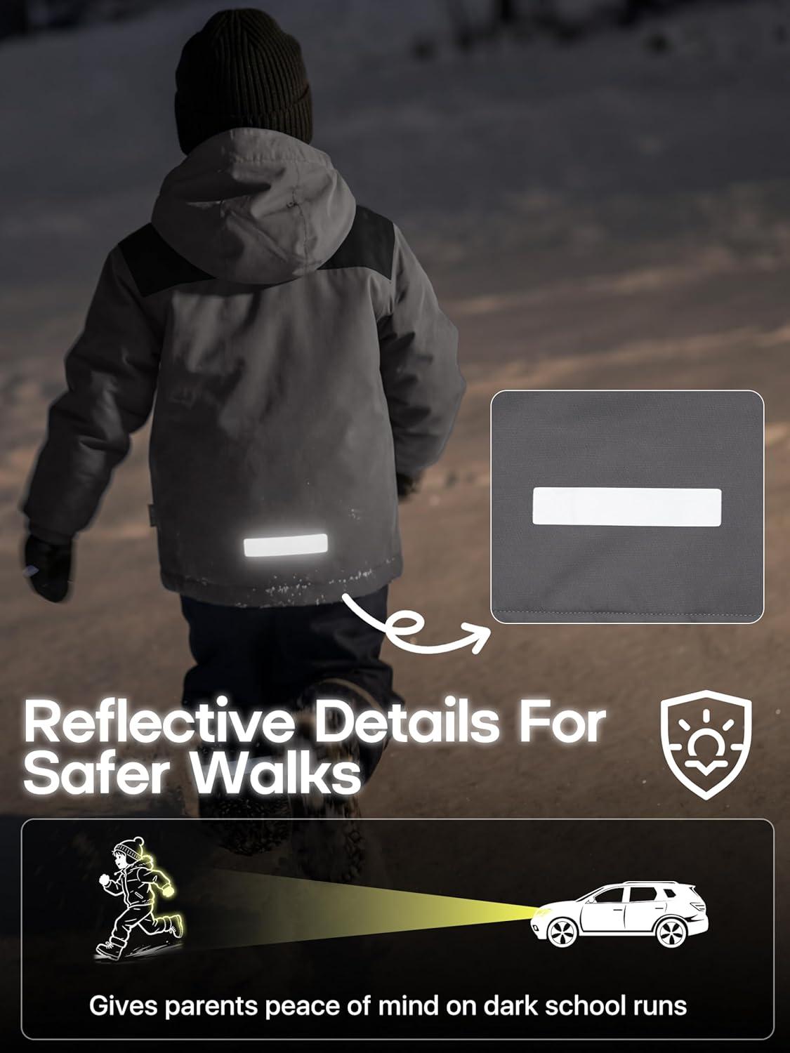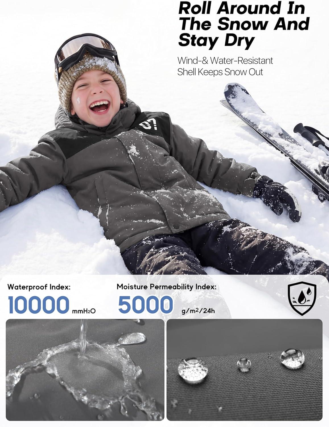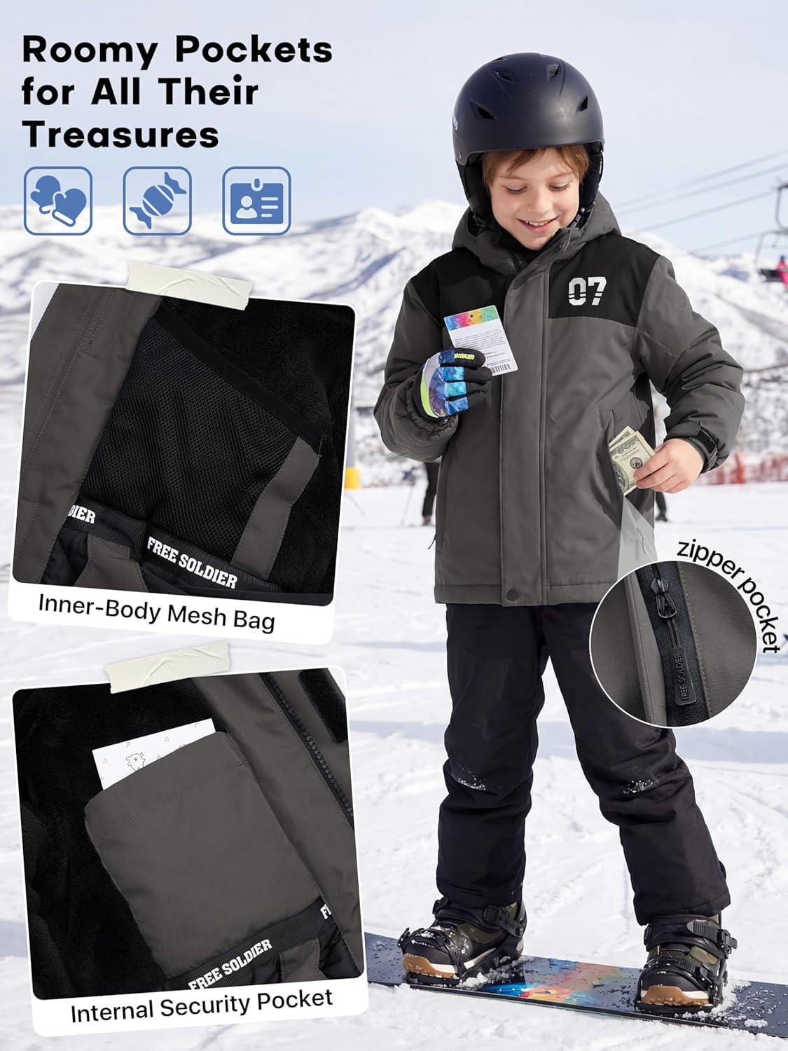 FREE SOLDIER Boy’s Waterproof Warm Ski Jacket Windproof Fleece Thick Kids Winter Coat with Hood for Snowboarding Outdoor(Grey)