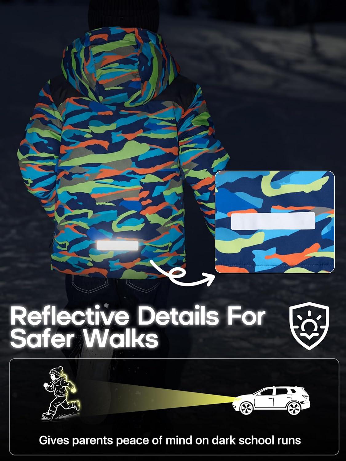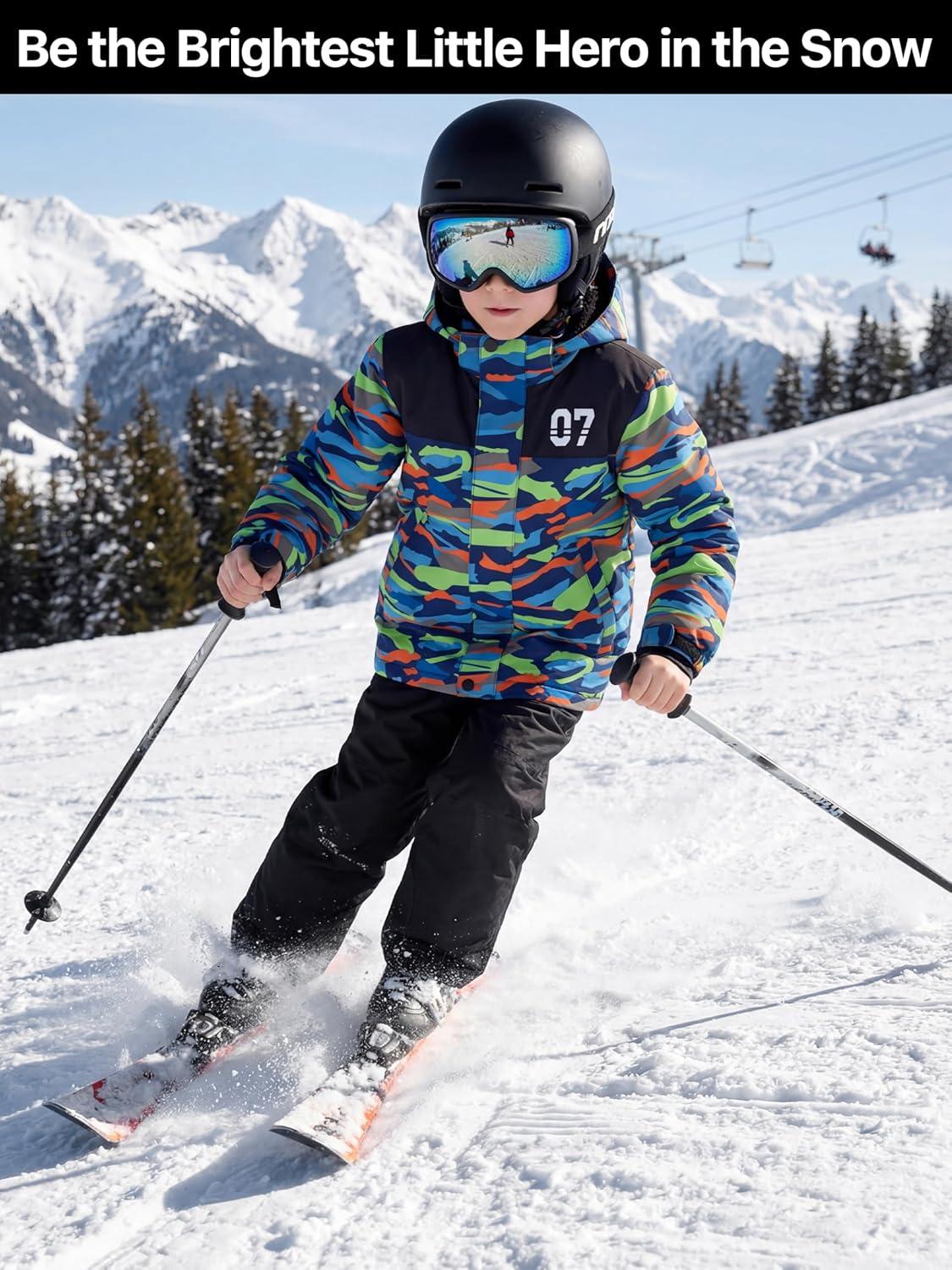 FREE SOLDIER Boy's Waterproof Warm Ski Jacket Windproof Fleece Thick Kids Winter Coat with Hood for Snowboarding Outdoor(Mountain Stripe)