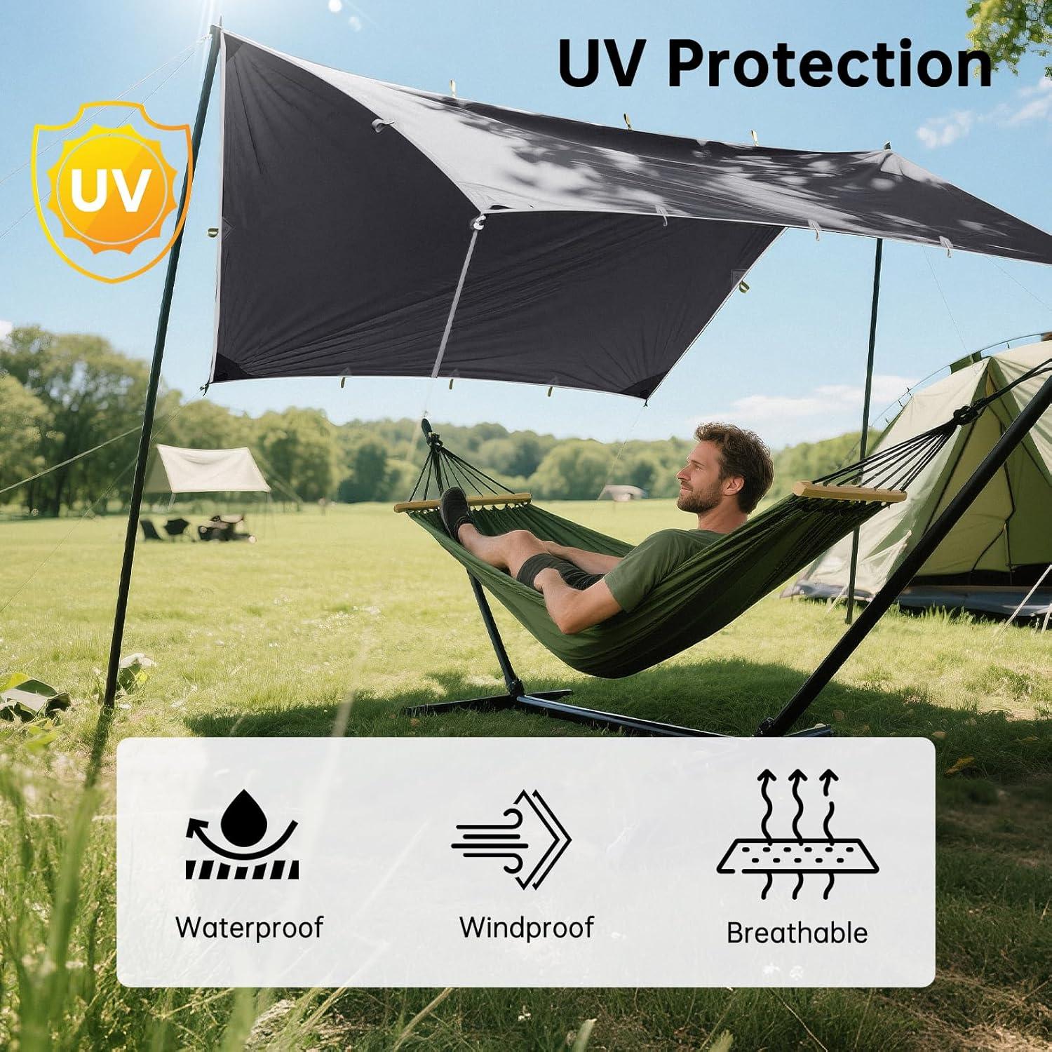HEAVY DUTY&PORTABLE:Large size in 118″ × 126″ when expended,enough for 2 persons.It's convenient to folded and put into a lightweight stuff sack when not in use,essential tarp gear for your outdoor travel.Net weight:1.2kg(42oz),not super light but heavy duty