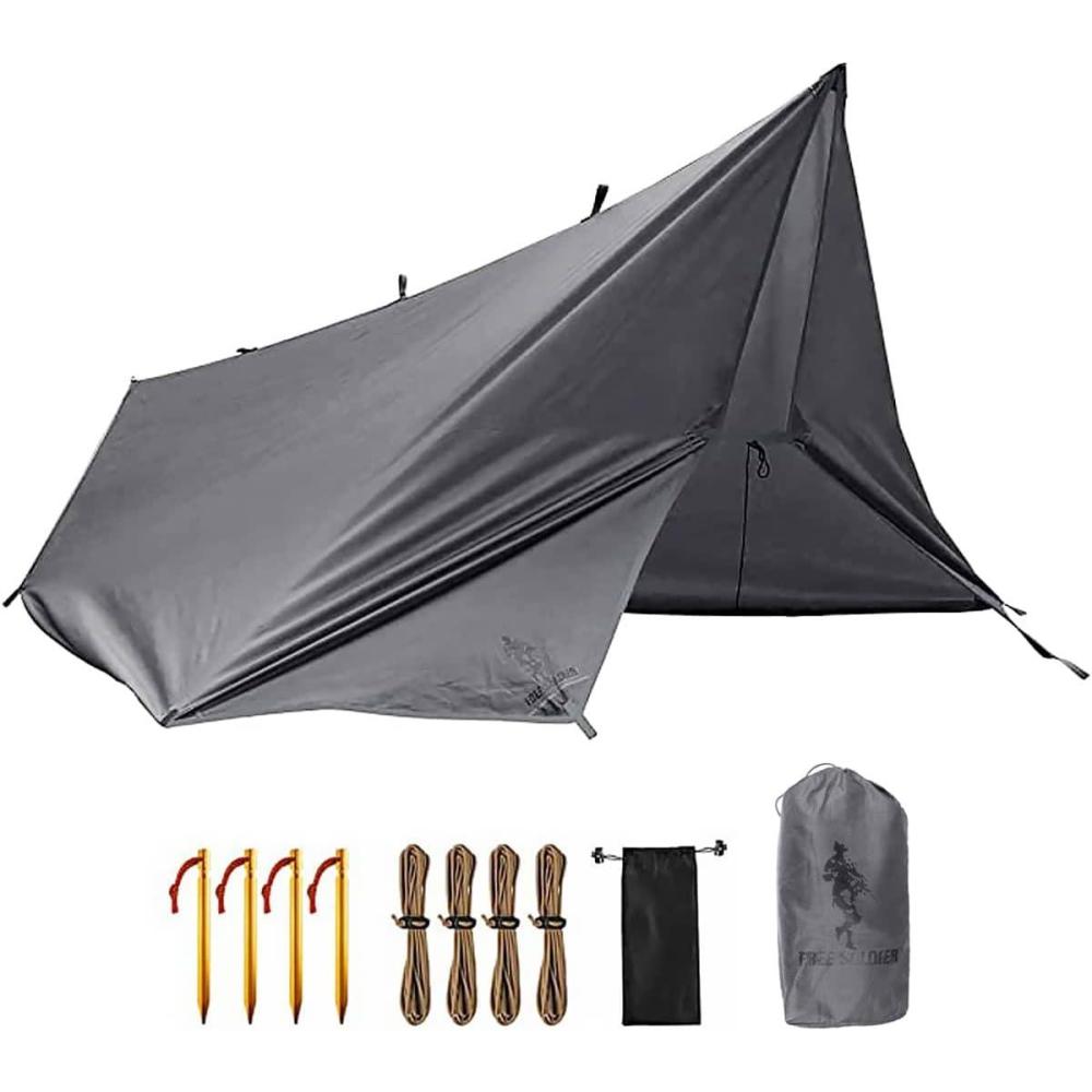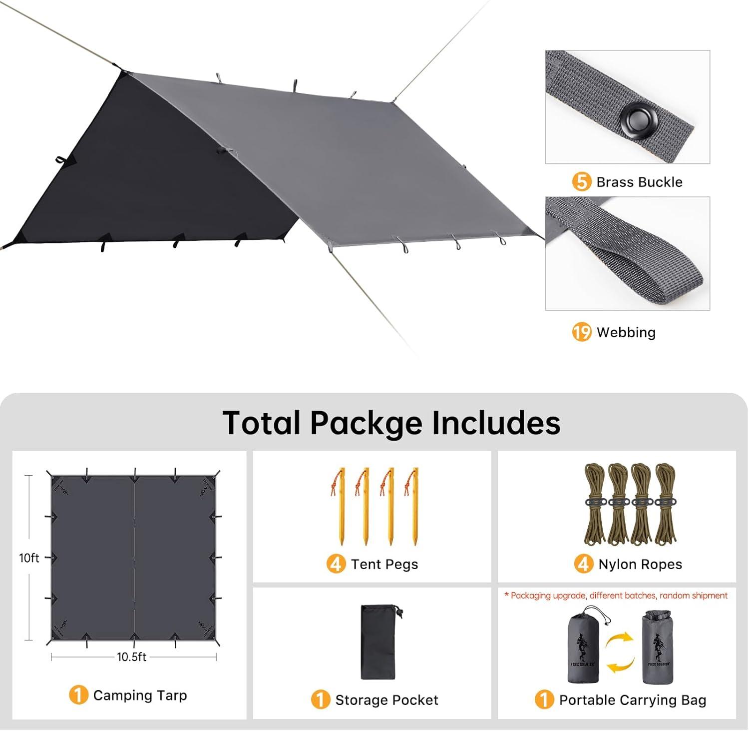 WATERPROOF&UV PROTECTION:Hammock Camping Tarp made of 150D ripstop polyester fabric with 3000 PU waterproof rating,enhanced the shelter's waterproof function and offers long-lasting protection,strengthen tear resistant&puncture resistant material without any worries.FREE SOLDIER Backpacking Tarp also can be put up as awning is effectively for blocking ultraviolet ray and protect your skin from the sun