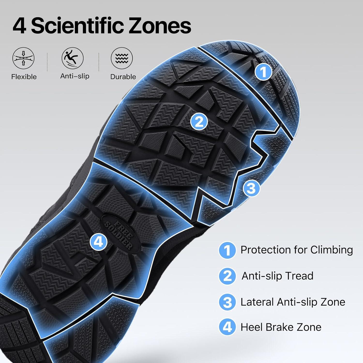 WATERPROOF & COMFORTABLE – Thinner fabric and vented holes in the collar made this work boots more breathable and comfortable in hot weather. Removable insole and breathable lining make this work shoes more sweat releasing and quick-drying, keeps your feet dry