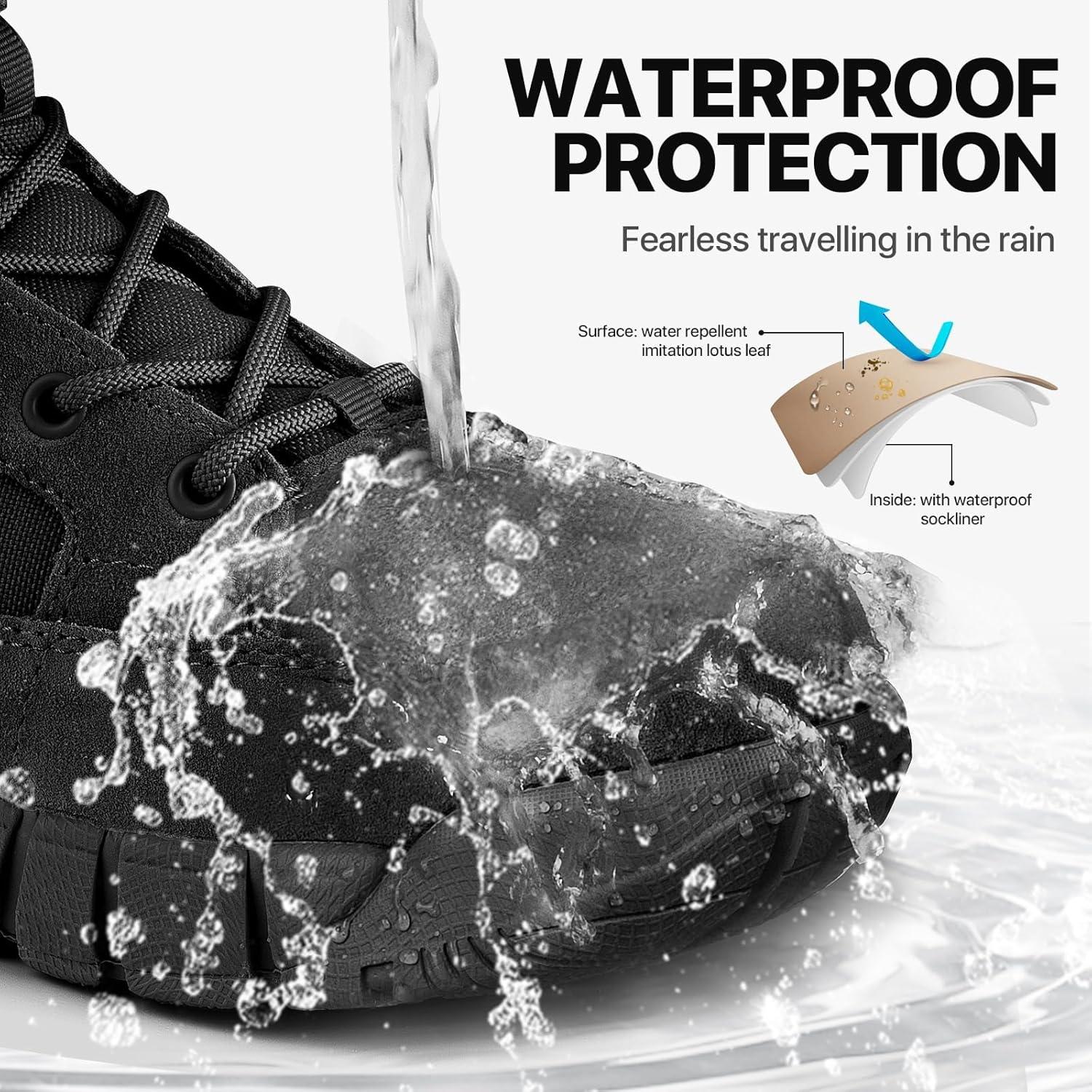 WATERPROOF & BREATHABLE : These waterproof boots for women feature a waterproof leather upper that ensures your feet stay dry in wet conditions. The waterproof sock liner effectively blocks rain and puddles, keeping your feet comfortable and dry even in the harshest weather conditions. Together with the breathable material, these tactical boots for women provide excellent air circulation to prevent moisture buildup, breathable and waterproof to keep feet fresh and comfortable all day long