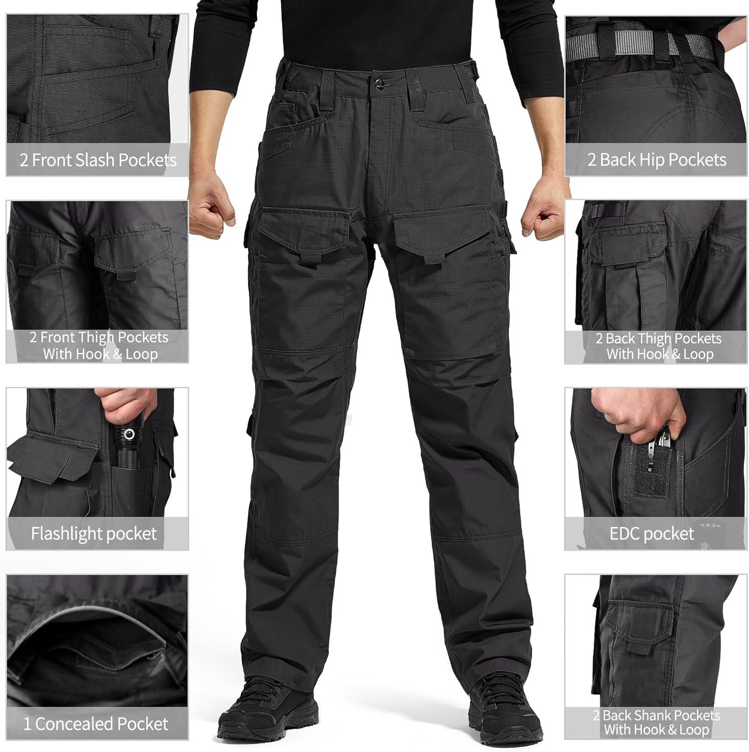 [Functional pockets] This tactical pants have 11 multifunctional pockets for transporting various tools and equipment. 2 front slash pockets, 2 front thigh pockets with hook & loop and 1 Flashlight pocket, 1 tactical pen pocket 2 back hip pockets, 2 back thigh pockets with hook & loop, Back Thigh EDC Pocket