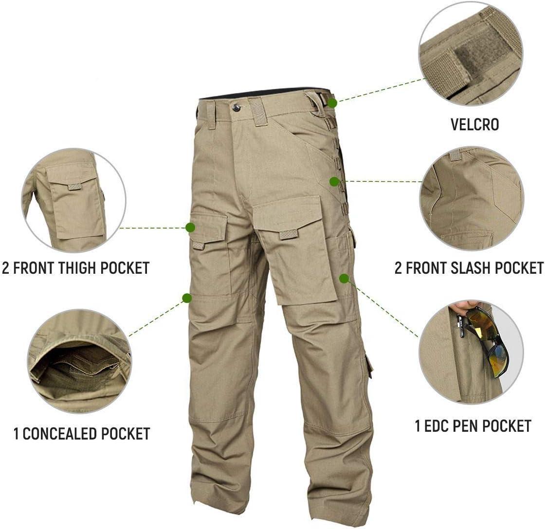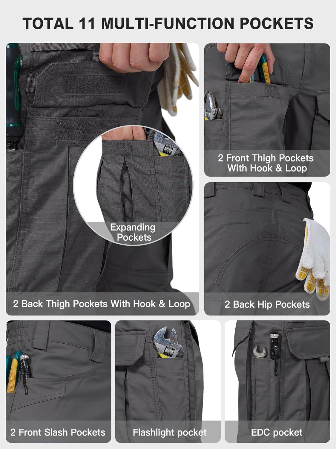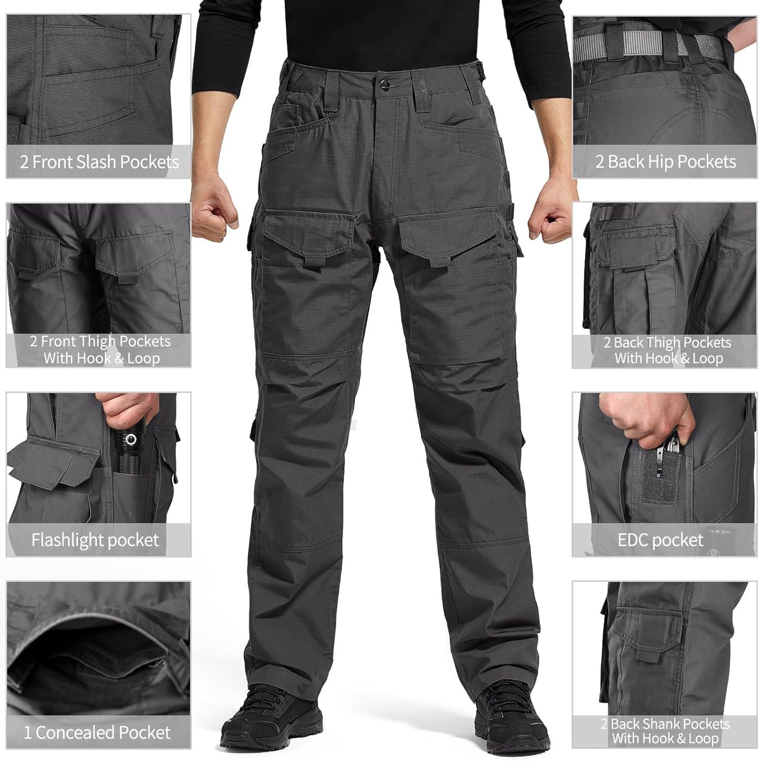 [Functional pockets] This tactical pants have 11 multifunctional pockets for transporting various tools and equipment. 2 front slash pockets, 2 front thigh pockets with hook & loop and 1 Flashlight pocket, 1 tactical pen pocket 2 back hip pockets, 2 back thigh pockets with hook & loop, Back Thigh EDC Pocket