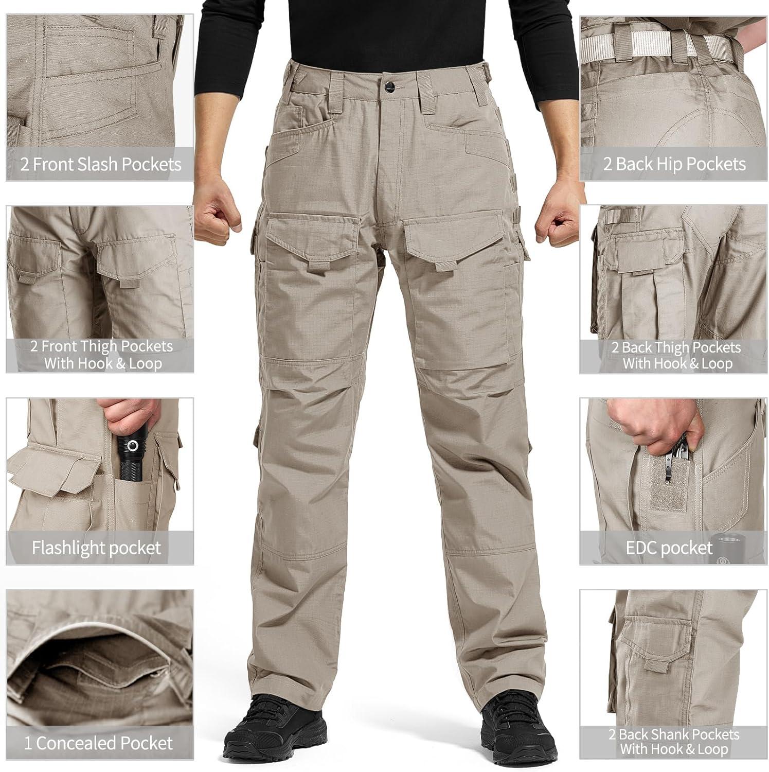 [Functional pockets] This tactical pants have 11 multifunctional pockets for transporting various tools and equipment. 2 front slash pockets, 2 front thigh pockets with hook & loop and 1 Flashlight pocket, 1 tactical pen pocket 2 back hip pockets, 2 back thigh pockets with hook & loop, Back Thigh EDC Pocket