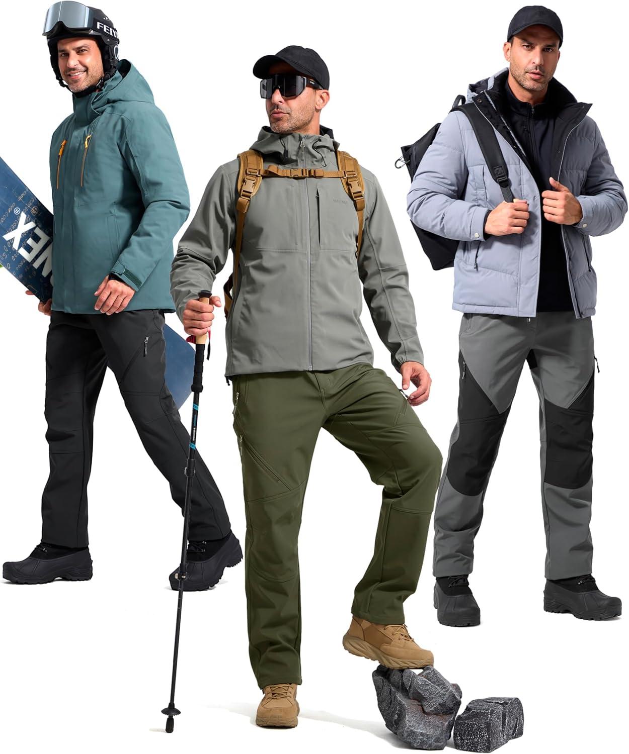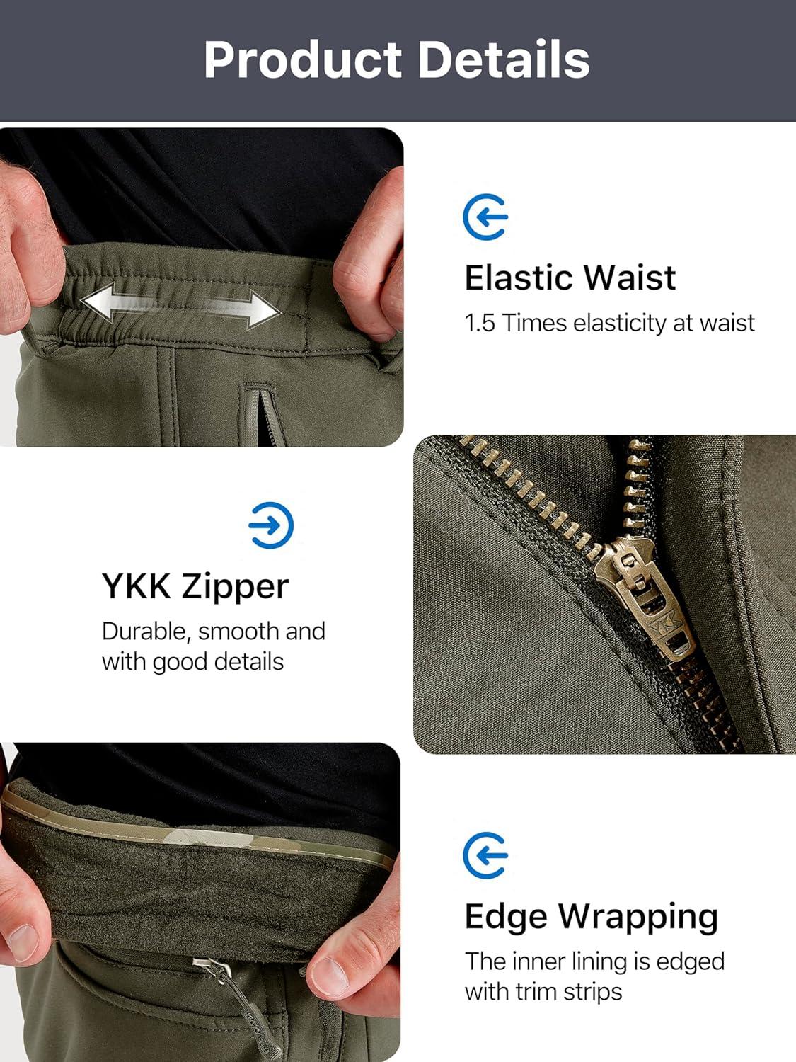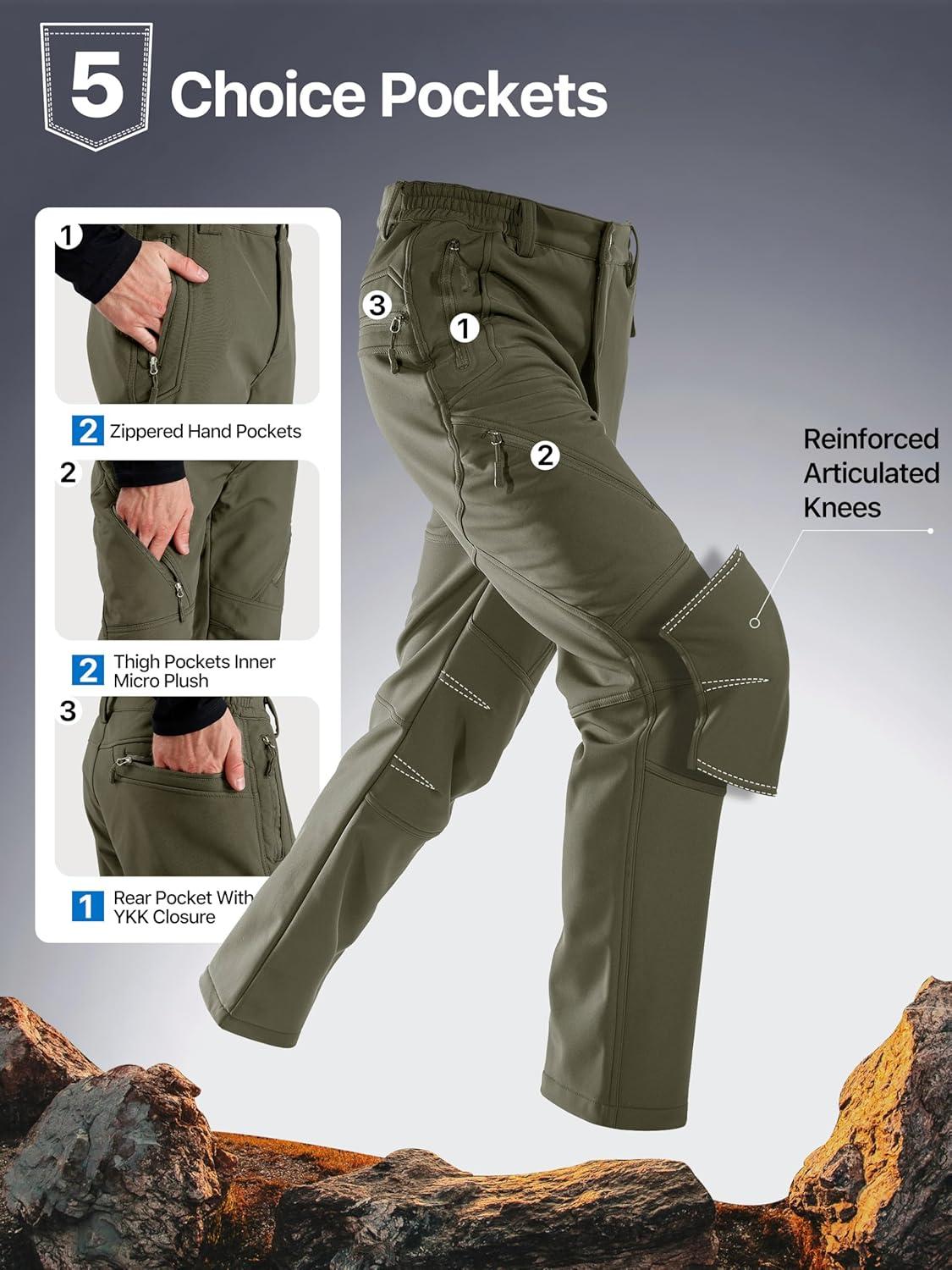 FREE SOLDIER Men’s Fleece Lined Outdoor Cargo Hiking Pants Water Repellent Softshell Snow Ski Pants with Zipper Pockets(Army Green)