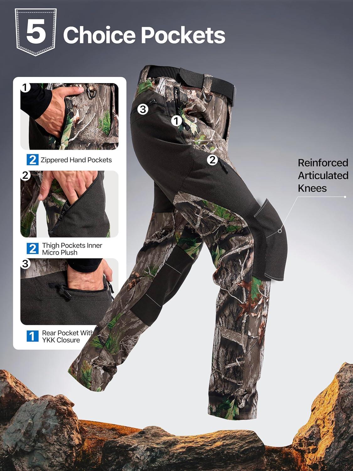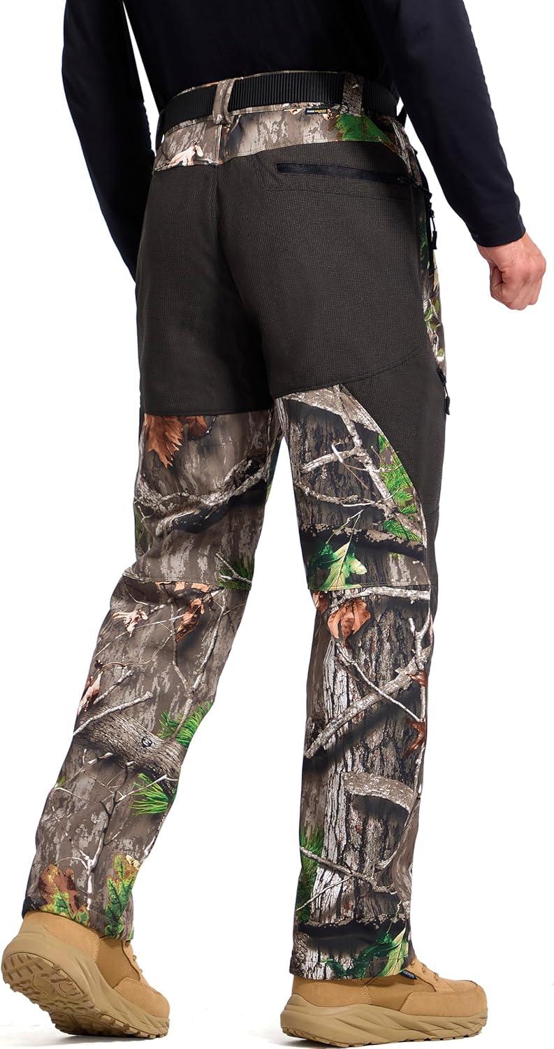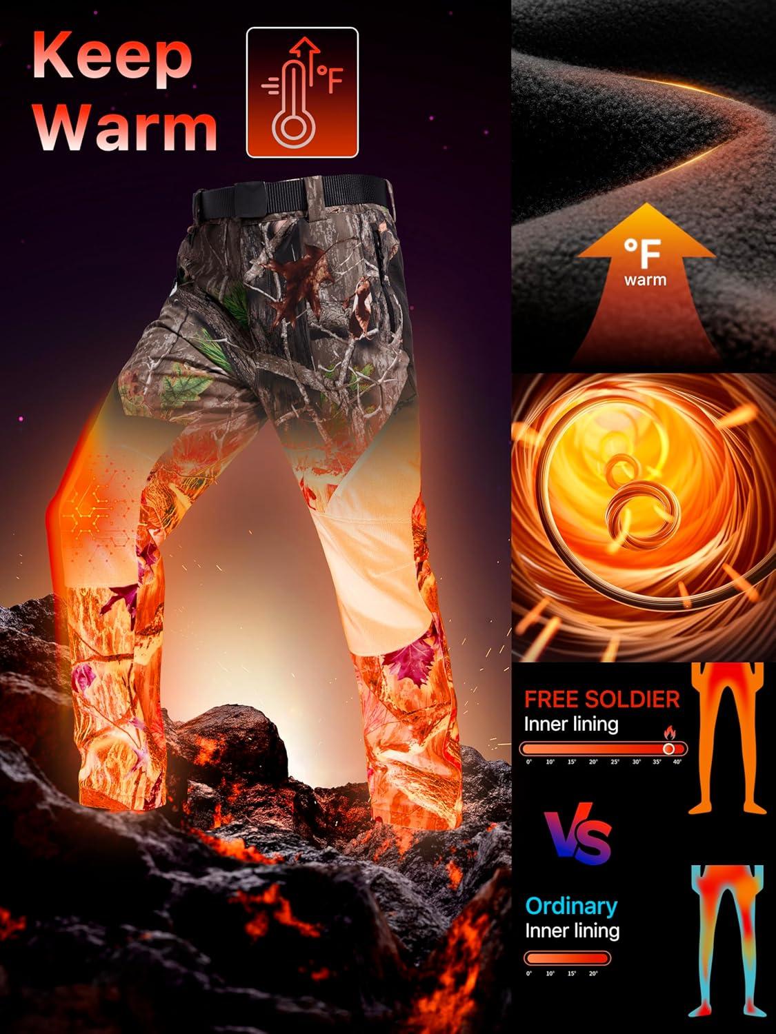 FREE SOLDIER Men’s Fleece Lined Outdoor Cargo Hiking Pants Water Repellent Softshell Snow Ski Pants with Zipper Pockets(Dark Camo)