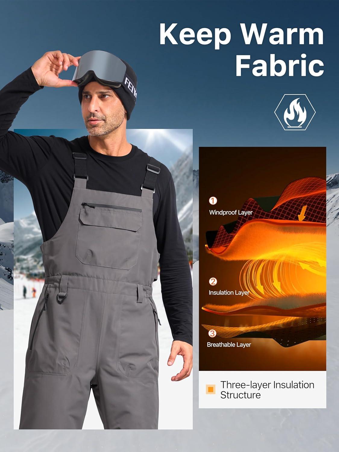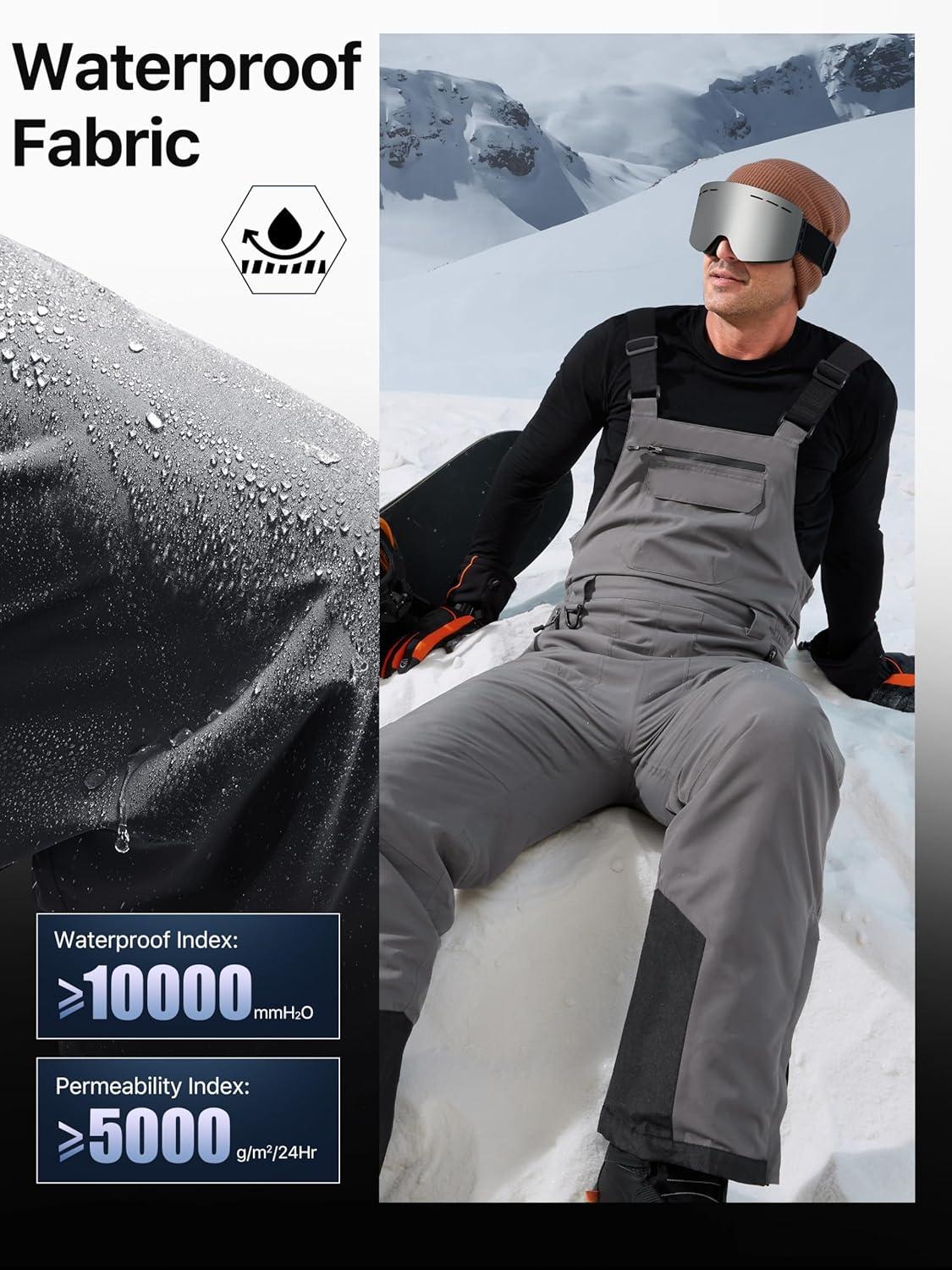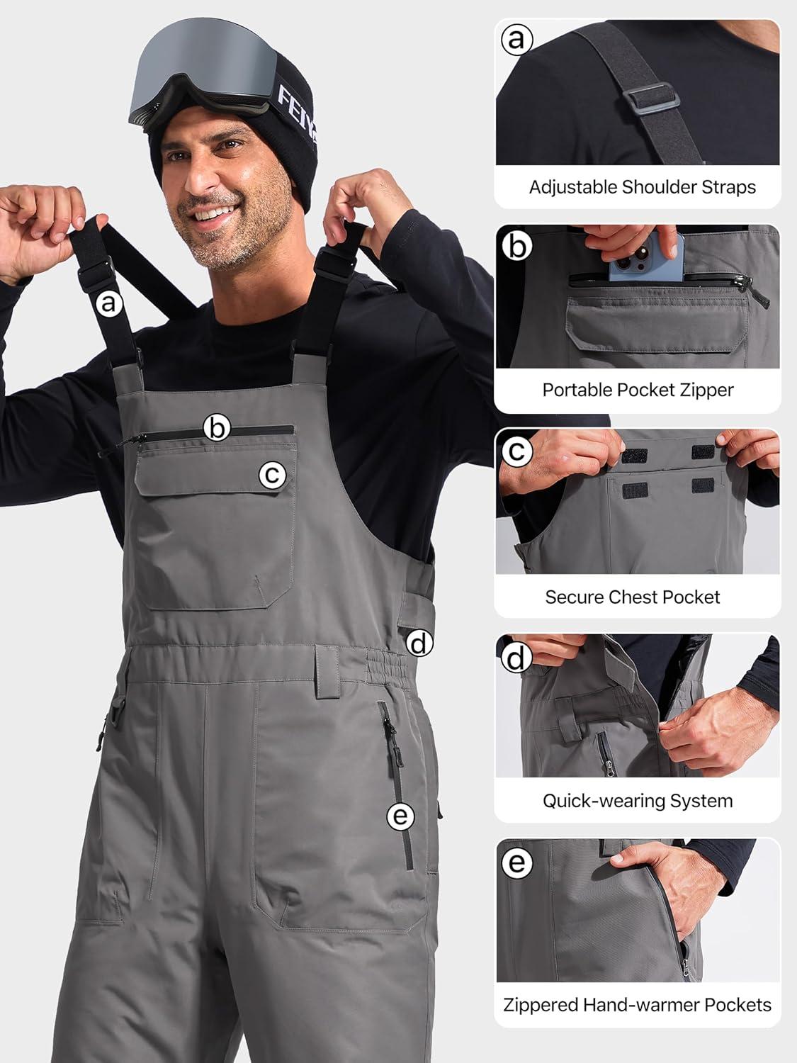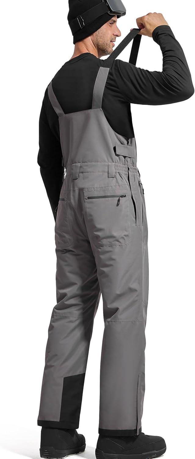 FREE SOLDIER Mens Snow Bibs Ski Pants Softshell Waterproof Insulated Warm Snow Pants Windproof Ski Bib Overalls(Gray)