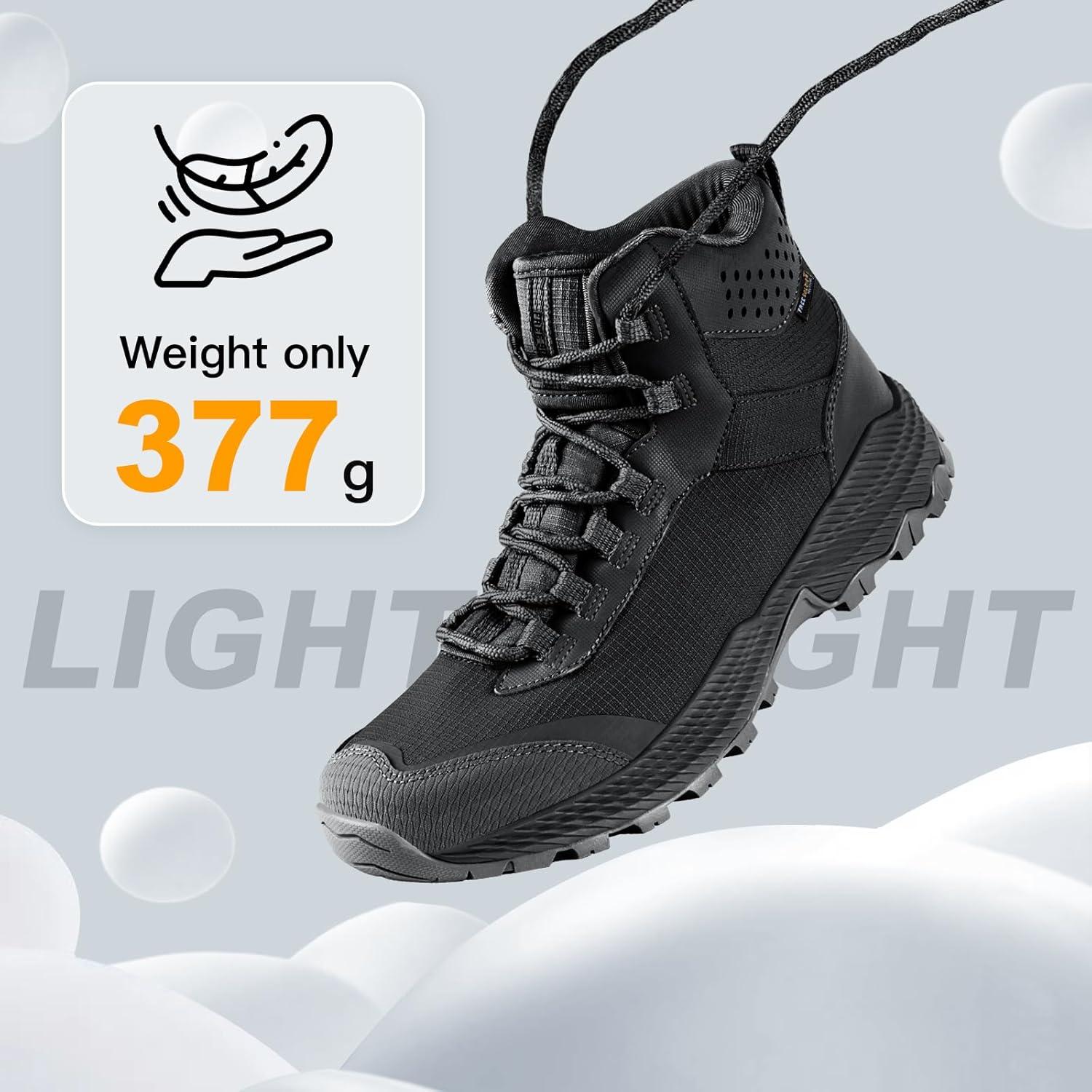 WATERPROOF & SCRATCH-RESISTANT: Made of high-resilient and scratch-resistant PU and nylon materials, our hiking boots feature 1.4mm embossed designs that offer maximum support and durability. The shoe surface is coated with a waterproof layer that keeps your feet dry and protected from water splashes. The interior is lined with Lycra to ensure your feet stay dry and comfortable