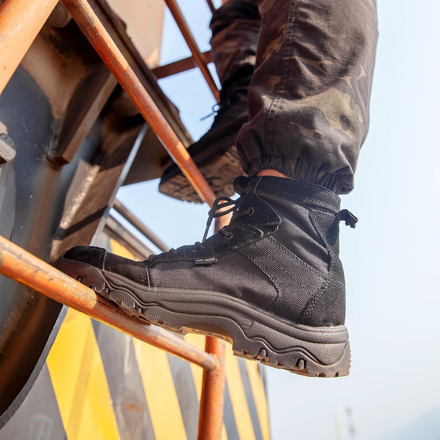 SRA ANTI-SLIP and WEAR RESISTANT – The outsole of these tactical hiking boots have been tested with SRA-level slip resistance. We add sodium dodecyl sulfate solution on the tile floor to test anti-slip, which ensures the grip of these tactical work boots on slippery surfaces. The rubber outsole has excellent wear resistance and can provide a long service life