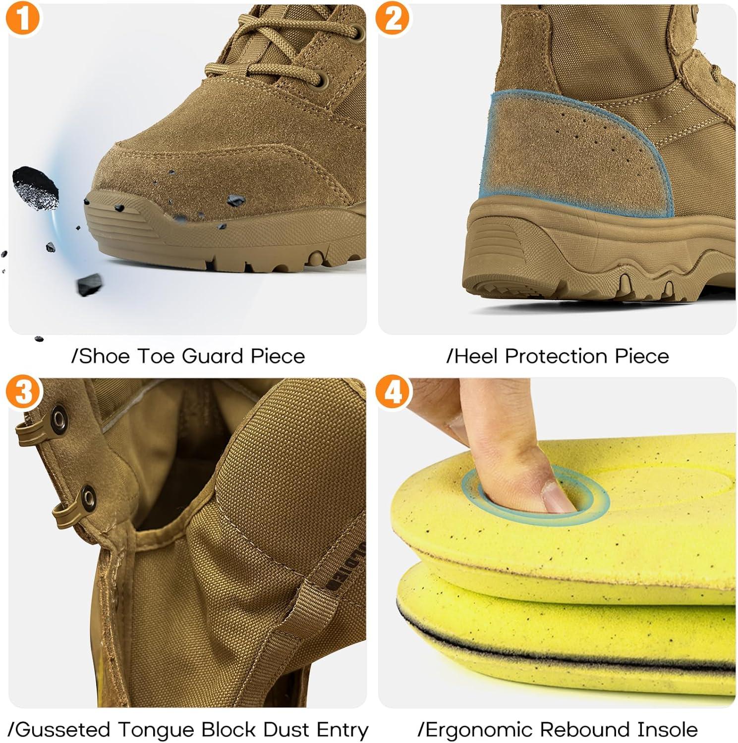SPLASH-PROOF and SANDPROOF – The exterior of the boots features a waterproof coating and the lining is made of Lycra, keeping your feet dry and breathable. Durable lace and quick fasten-up buckles allow you to put on and take off your desert boots more quickly, The boot's tongue effectively prevents pebbles, sand, mud, and other debris from entering the tactical boots, ensuring your feet stay comfortable on any terrain
