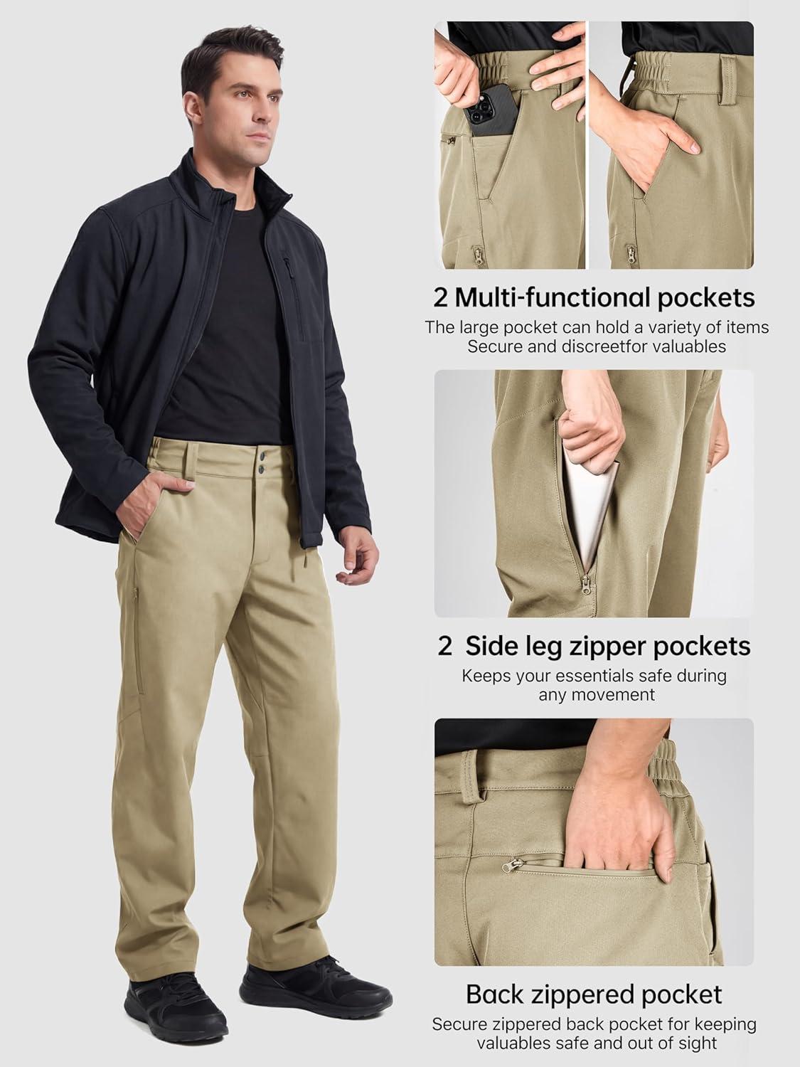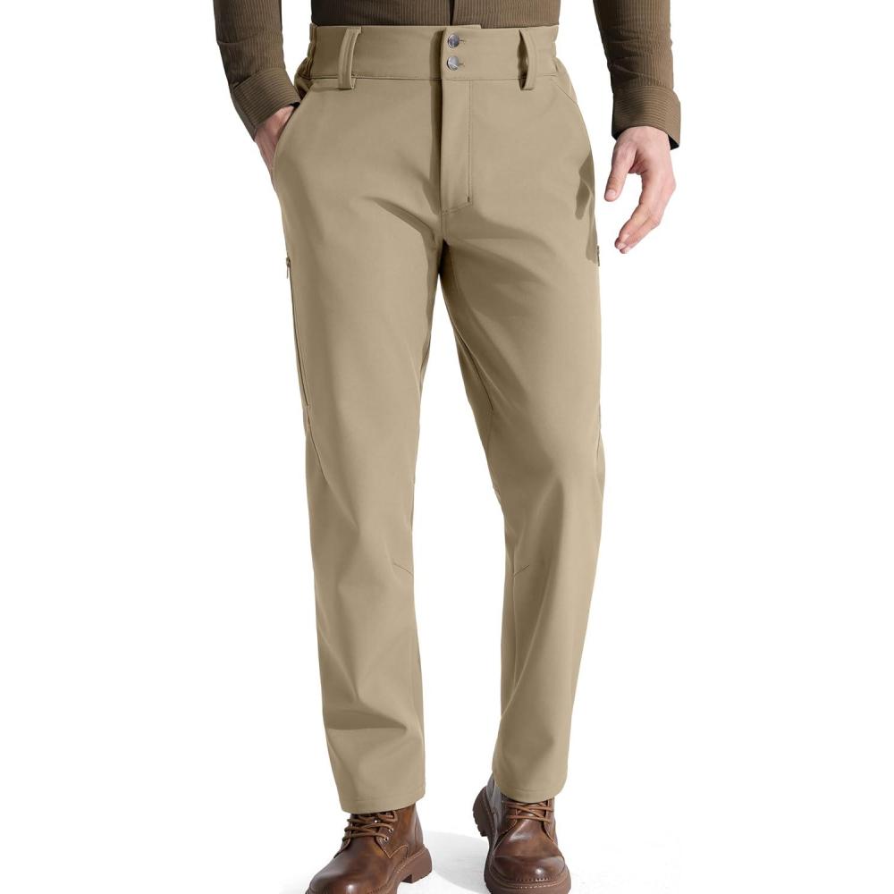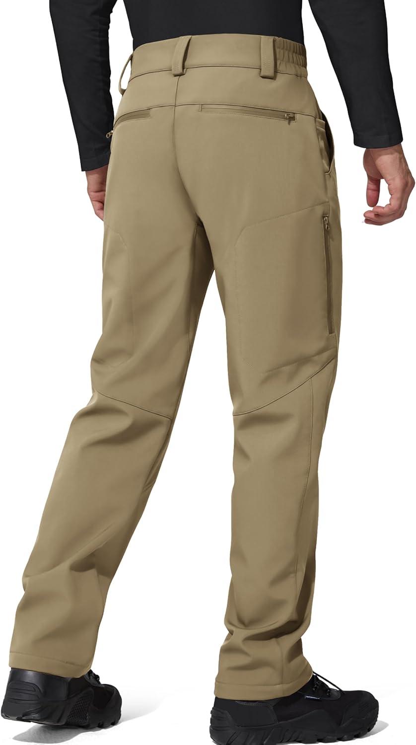 FREE SOLDIER Men’s Warm Windproof Winter Fleece Lined Pants Hiking Expandable-Waist Softshell Snow Ski Pants(Khaki)