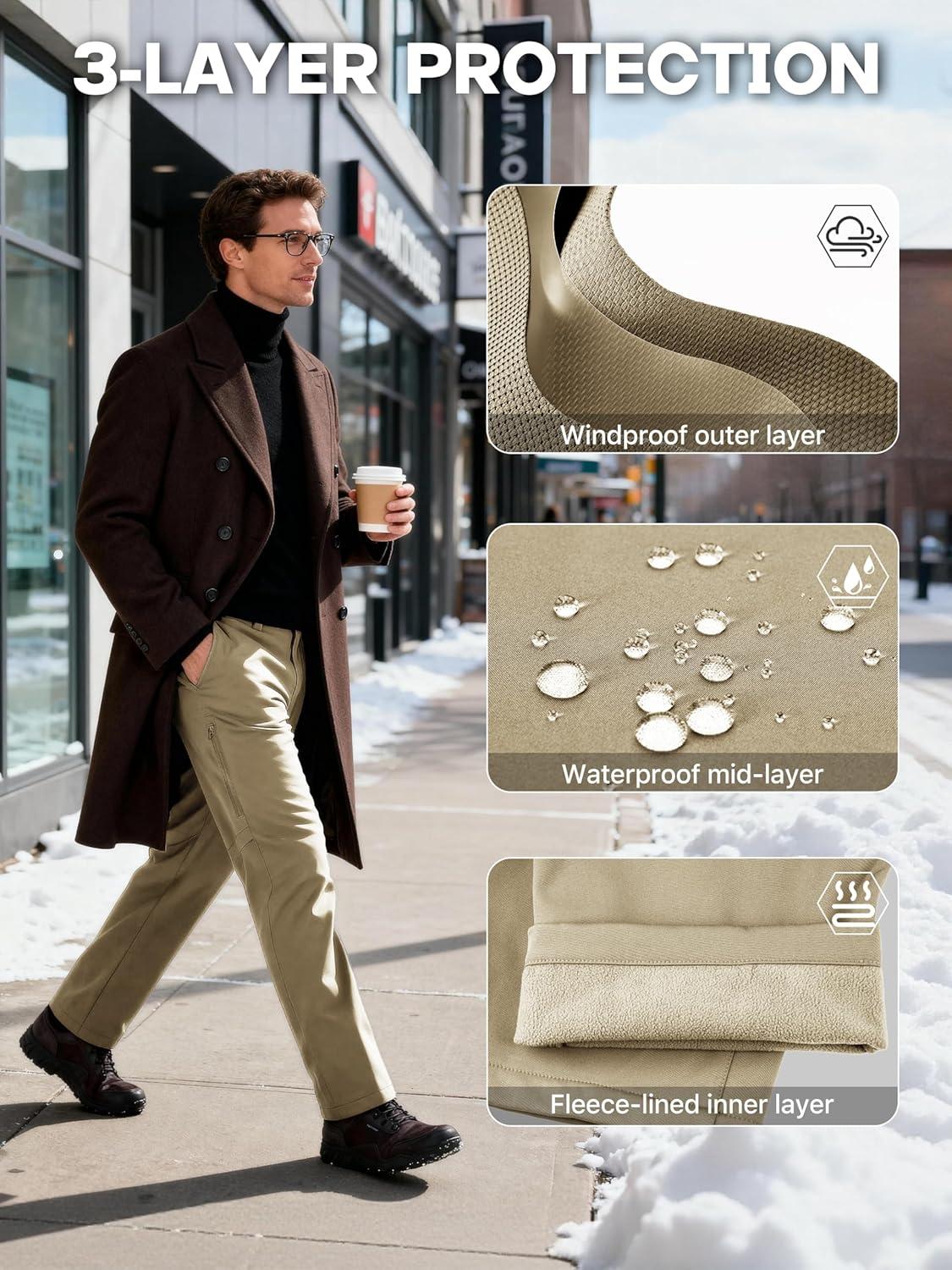 FREE SOLDIER Men's Warm Windproof Winter Fleece Lined Pants Hiking Expandable-Waist Softshell Snow Ski Pants(Khaki)