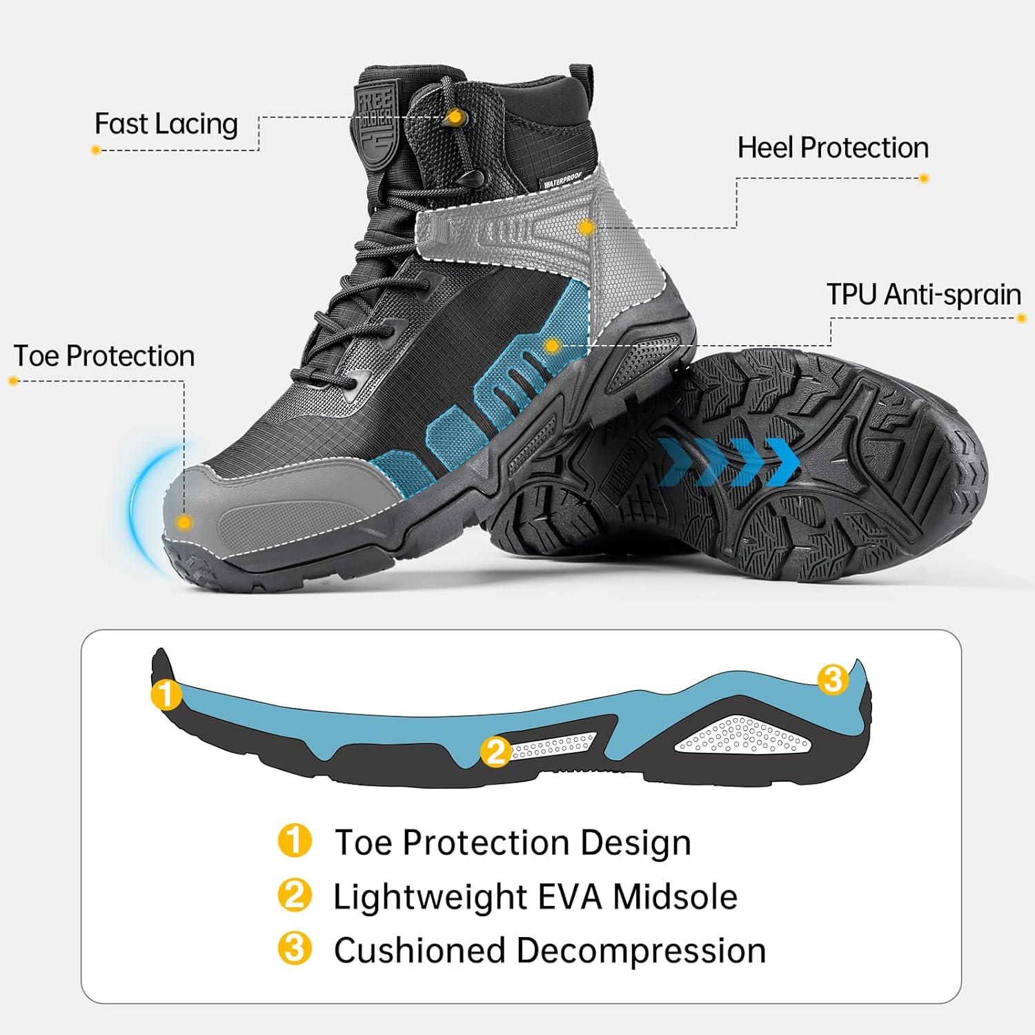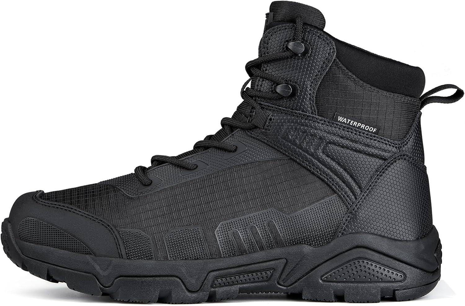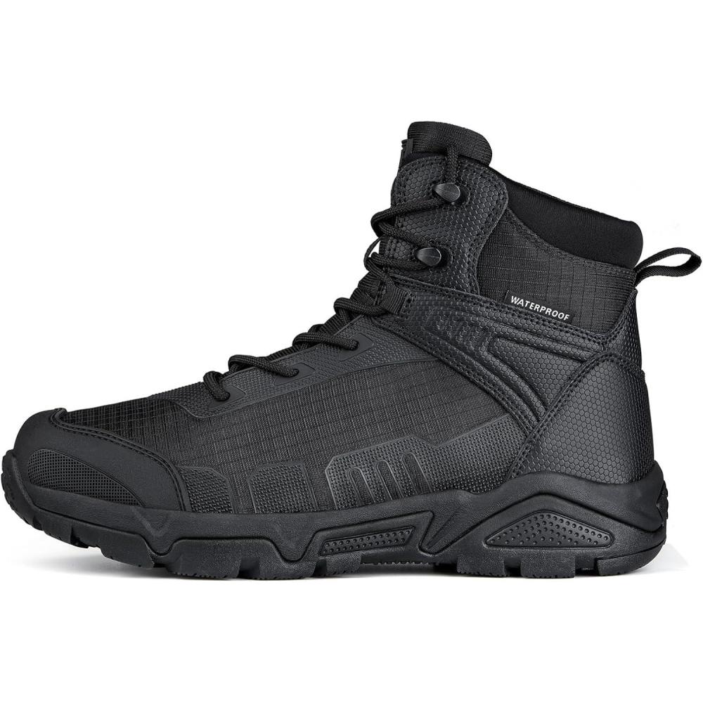 WATERPROOF & NON-SLIP-Waterproof coating on outer surface, well keep water from entering this mens waterproof work boots. Waterproof lycra lining that keeps feet dry and breathable provides long term comfort. Durable lace and quick fasten-up, for convenient waterproof tactical boots for men, Advanced vibram sole, all terrain outsole with geometric design, providing good anti-slip, advanced traction system provides stability well and grip