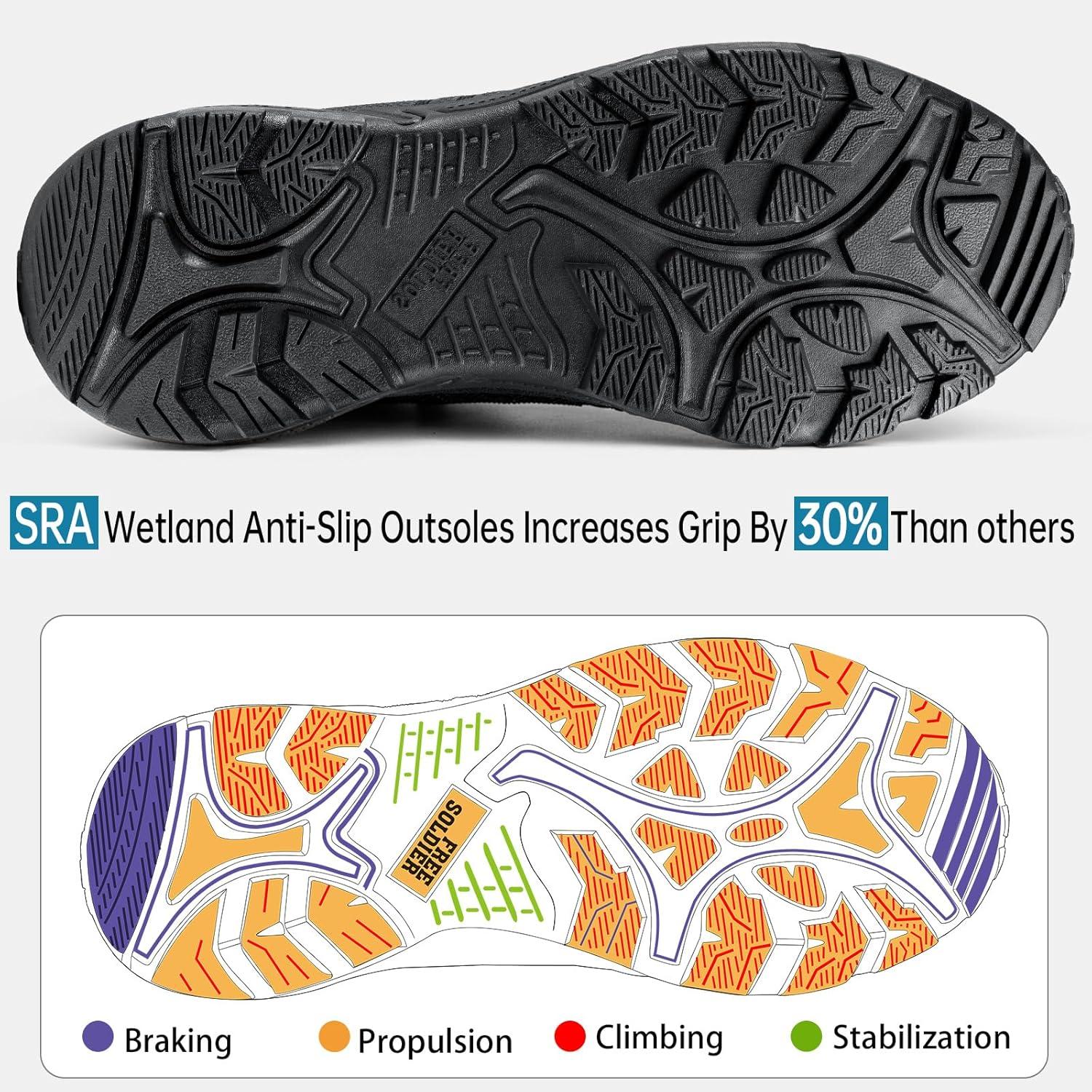 LIGHTWEIGHT & FIT – This lightweight hiking boots made with US size, fit !!! If you are hesitate to choose size, please confirm your feet length with our size chart. This brunt work boots for men weigh about 2.31 lb, super lightweight mens work boots. Won’t feel fatigue when wearing this hiking shoes, tactical shoes, camping shoes