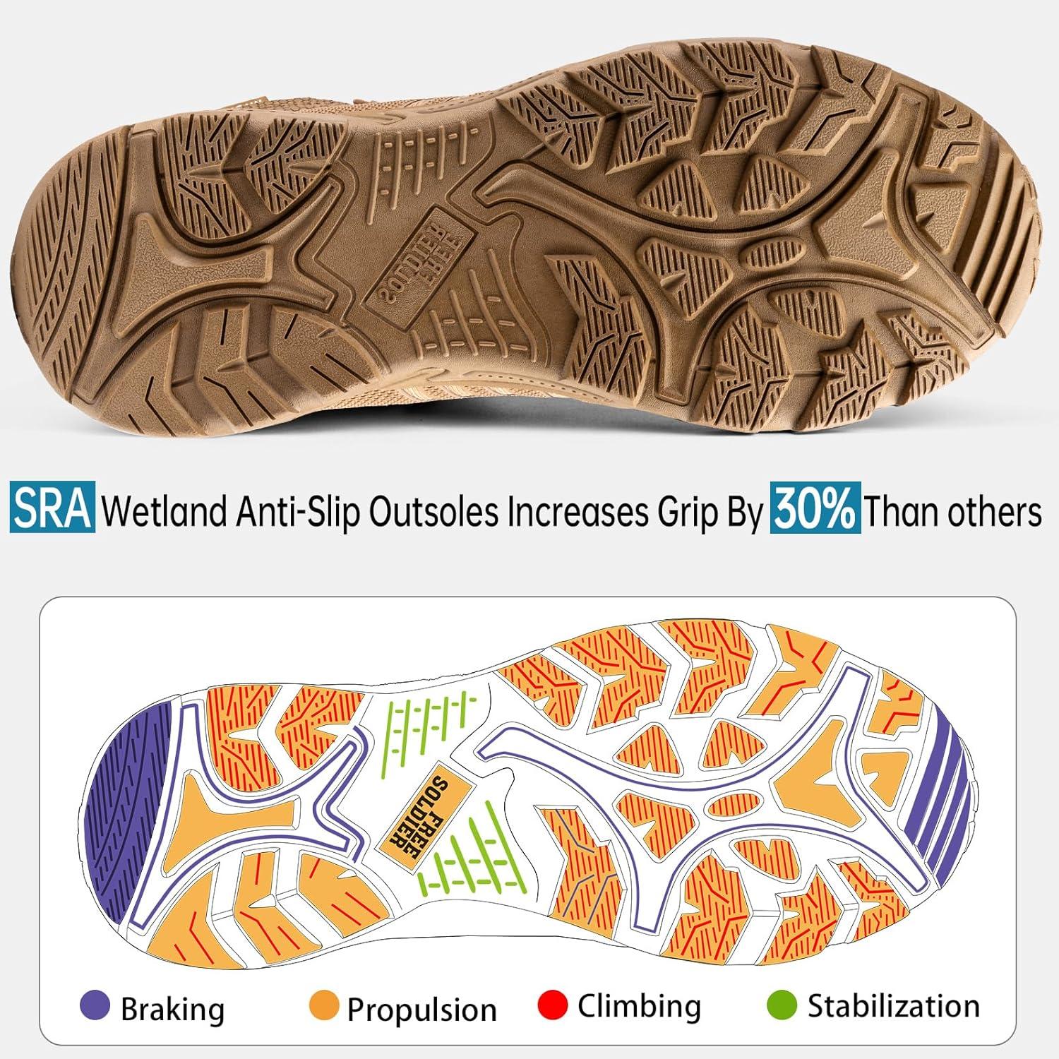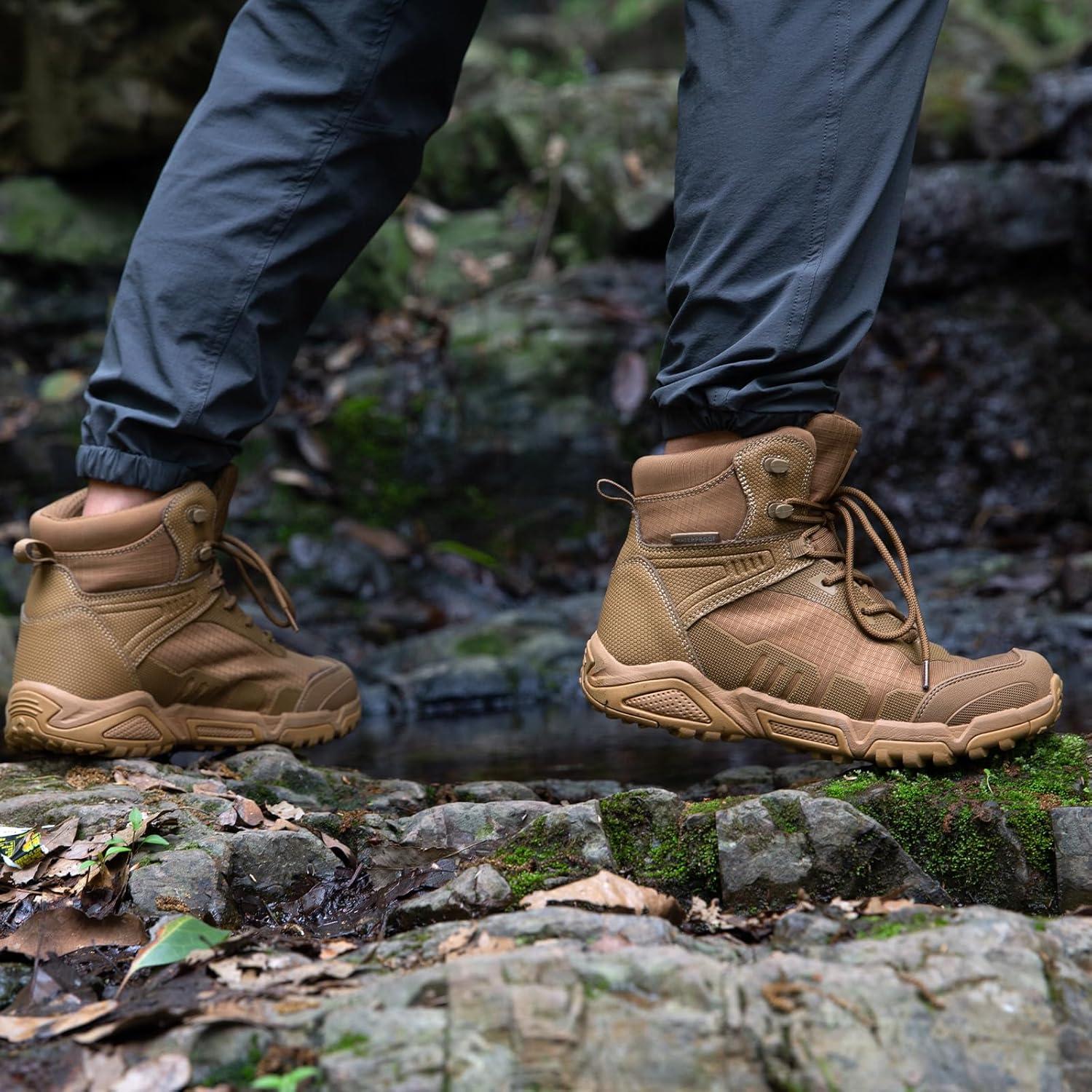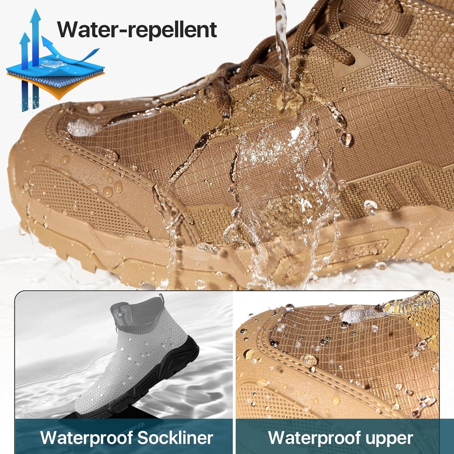 WATERPROOF & NON-SLIP-Waterproof coating on outer surface, well keep water from entering this mens waterproof work boots. Waterproof lycra lining that keeps feet dry and breathable provides long term comfort. Durable lace and quick fasten-up, for convenient waterproof tactical boots for men, Advanced vibram sole, all terrain outsole with geometric design, providing good anti-slip, advanced traction system provides stability well and grip