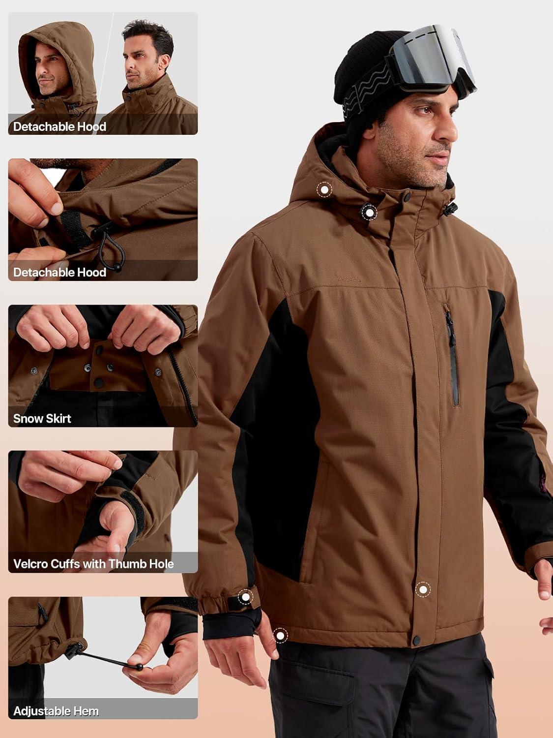 FREE SOLDIER Men's Waterproof Ski Jacket Fleece Lined Warm Winter Snow Coat with Hood Fully Taped Seams(Nut Brown)