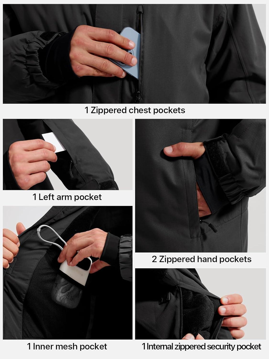 FREE SOLDIER Men's Waterproof Ski Snow Jacket Fleece Lined Warm Winter Rain Jacket with Hood Fully Taped Seams(Black)