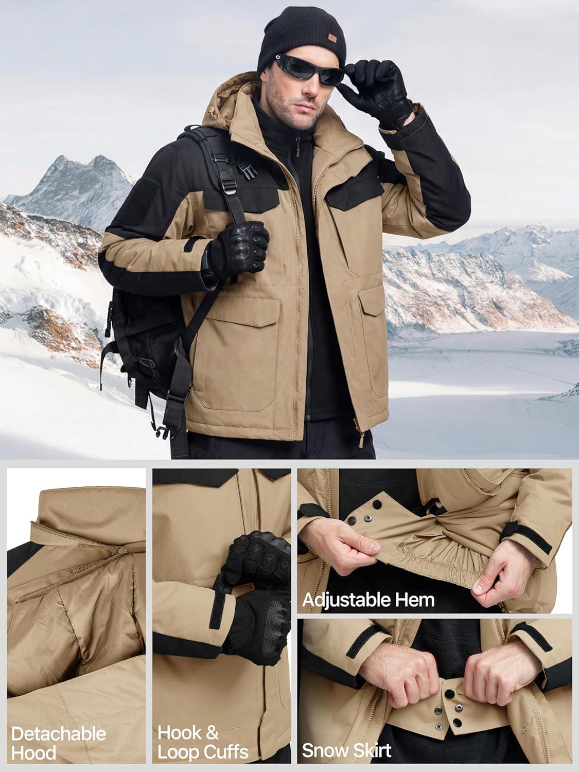 Windproof Ski Jacket Men: The inner stretchy snow skirt & adjustable drawstring hem prevents wind and snow from entering this men winter jacket. Adjustable and detachable hood makes this winter coat for men head protective even in windy day, stand collar with chin guard, full zip closure with internal and outer flap help to keep cold out