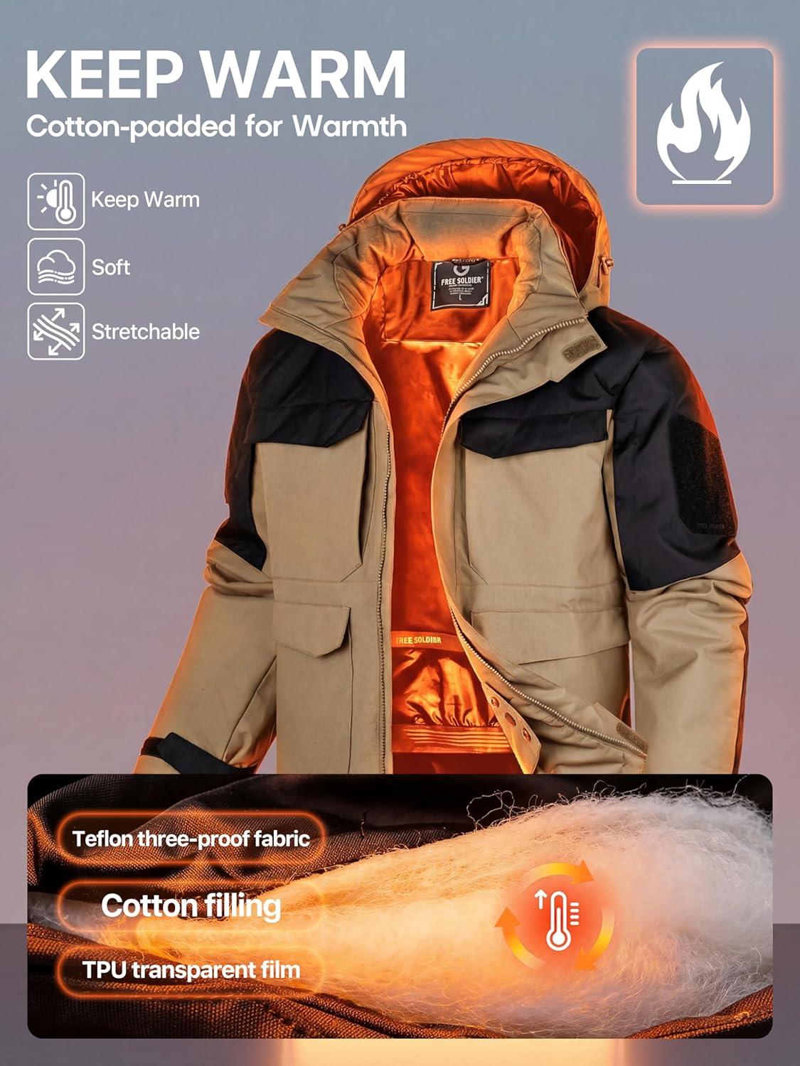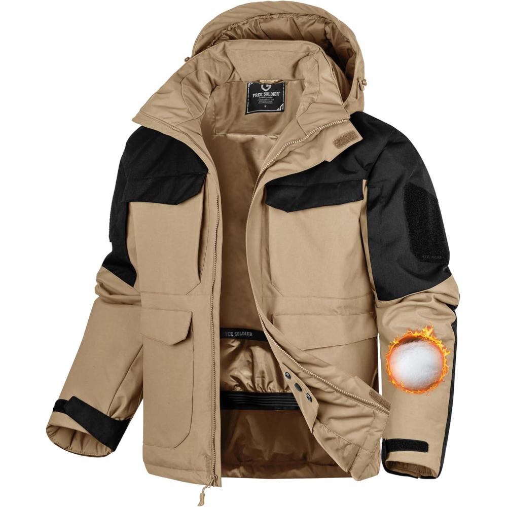 FREE SOLDIER Men’s Waterproof Ski Winter Jacket Warm Winter Snow Snowboard Coat with Multi Pockets Detachable Hood(Khaki)