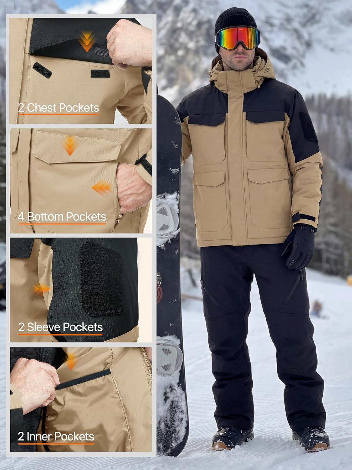 Multi-Pocket Snow Jacket Men: Designed with 10 pockets – 2 zippered hand pockets with top and side entry to secure items and keep hand warm, equivalent to 4 pockets; 2 chest pockets give you an additional place to stash stuff; 2 zippered sleeve pockets for key, cards or small accessories; 2 inner pockets keep the essentials secure while you're on-the-go