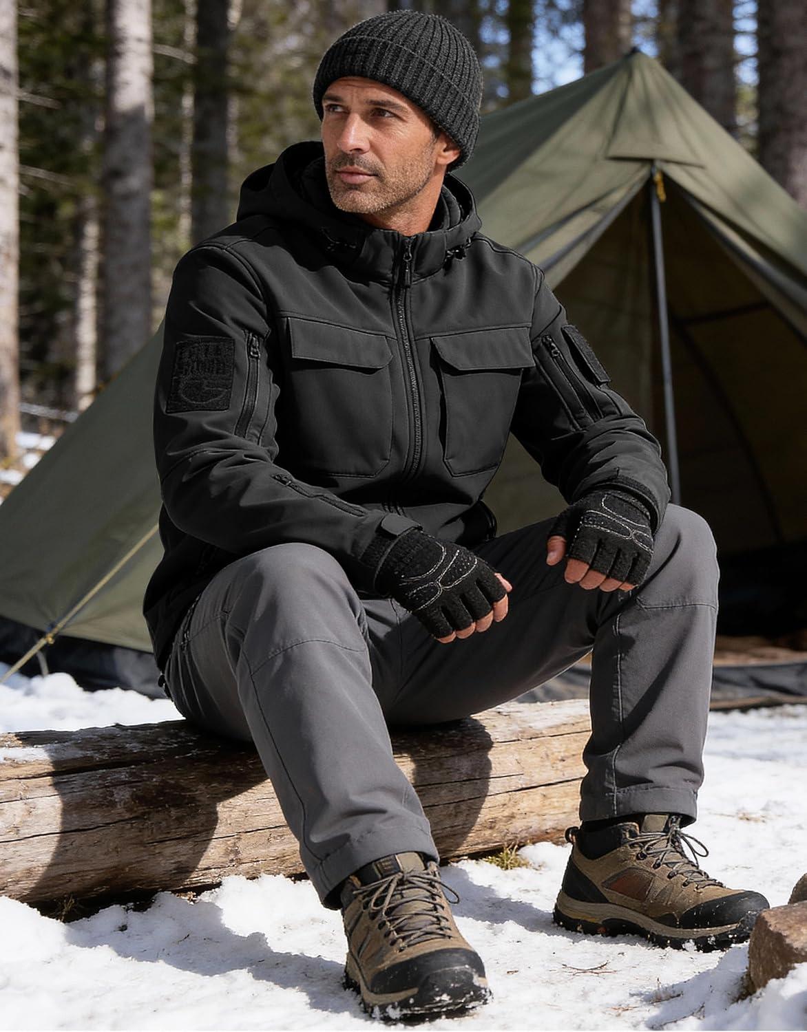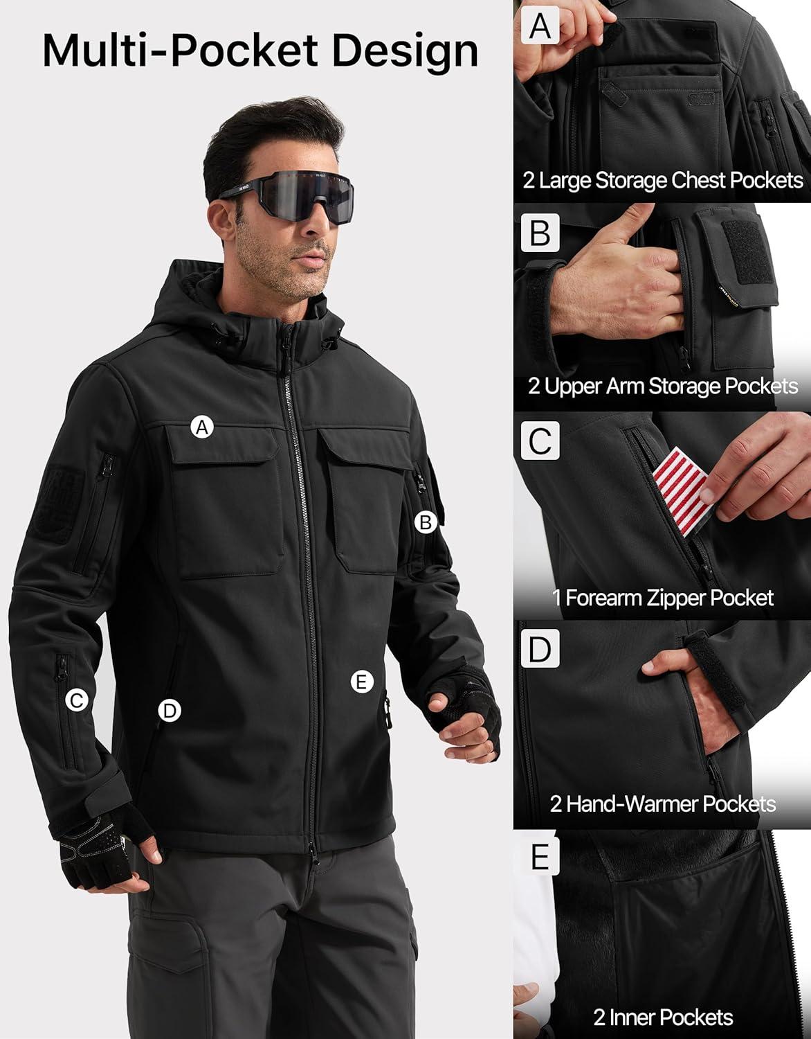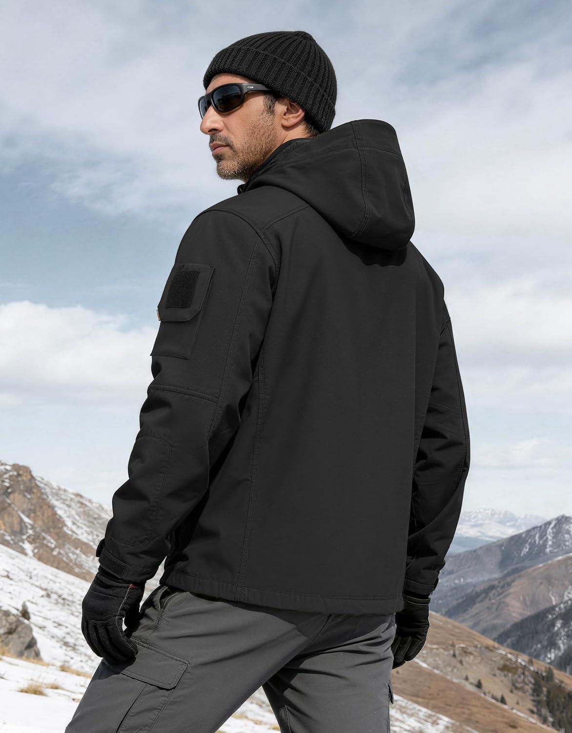 FREE SOLDIER Men's Waterproof Softshell Jacket Fleece Lined Outdoor Jacket Tactical Military Hoodie Windbreaker(Classic Black)