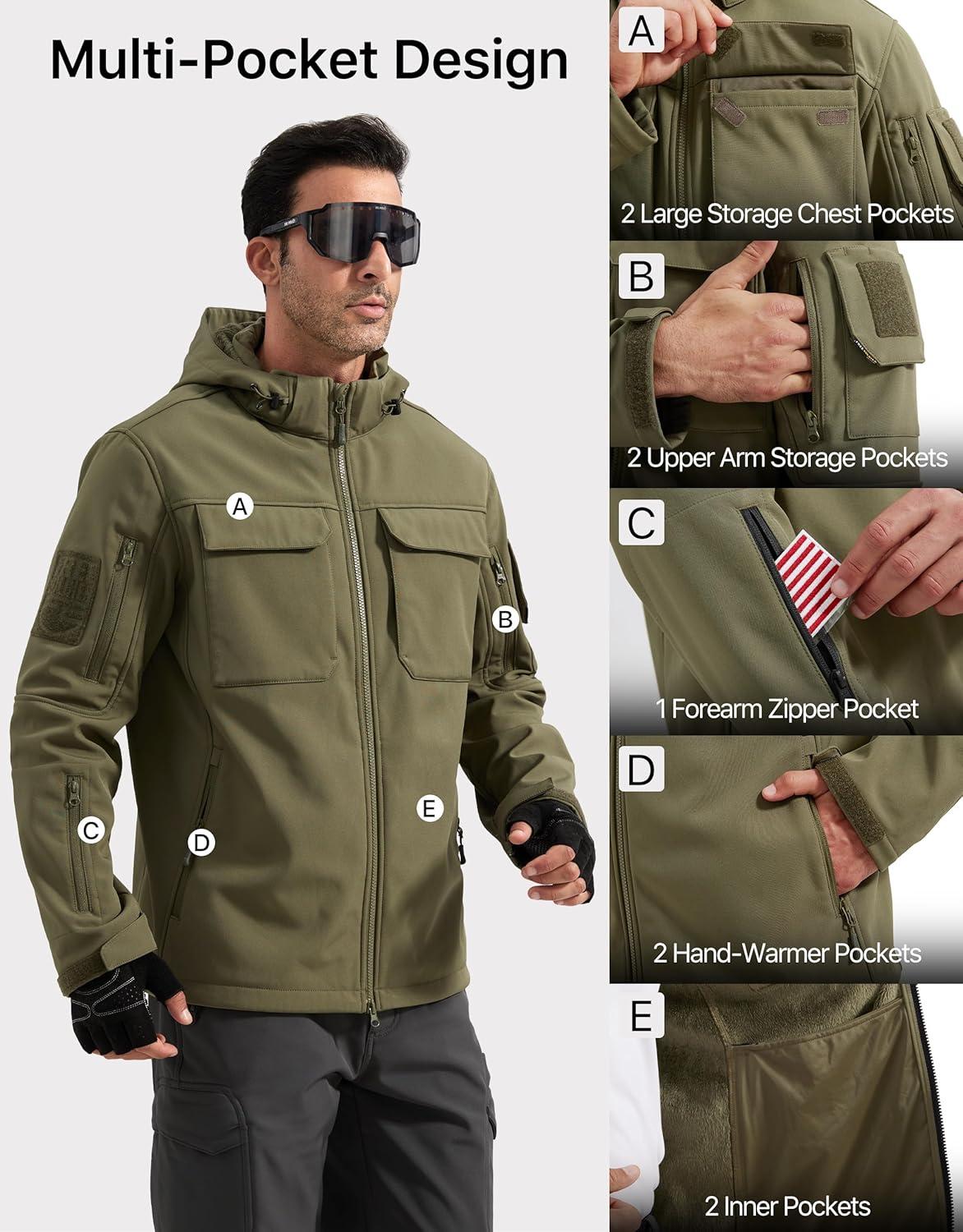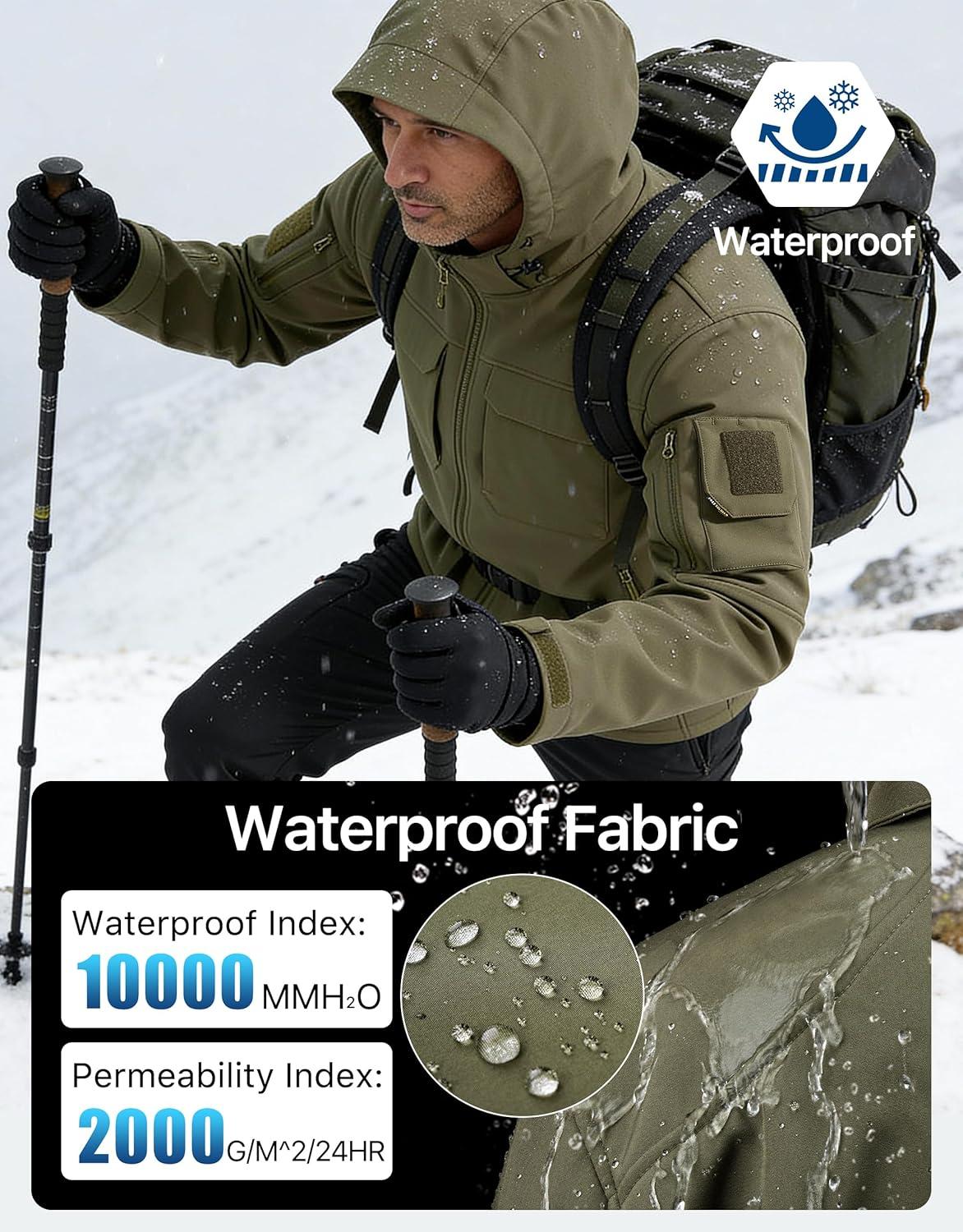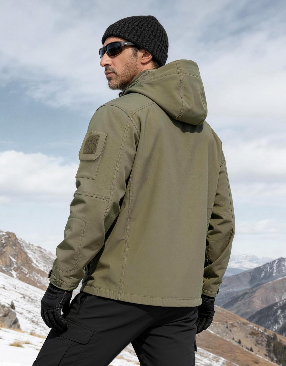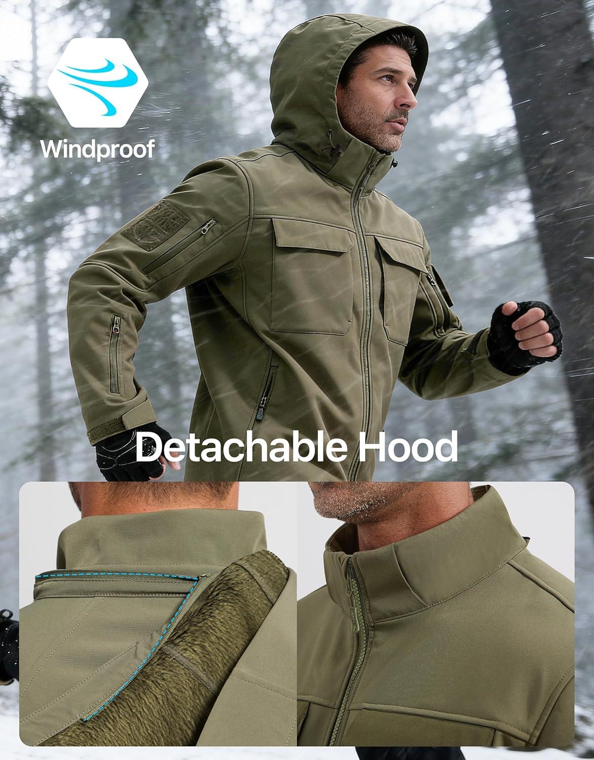 FREE SOLDIER Men’s Waterproof Softshell Jacket Fleece Lined Outdoor Jacket Tactical Military Hoodie Windbreaker(Classic Green)