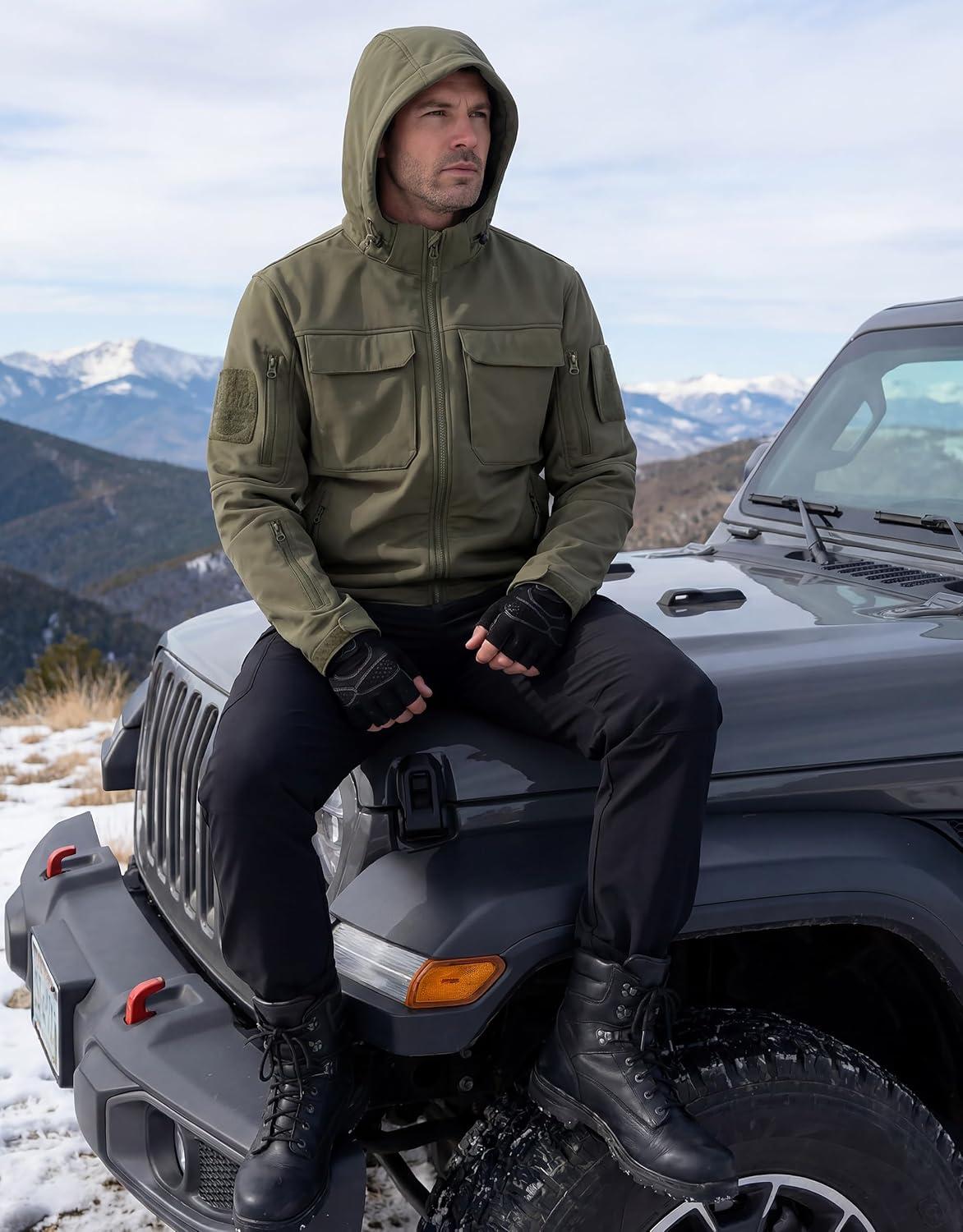 FREE SOLDIER Men’s Waterproof Softshell Jacket Fleece Lined Outdoor Jacket Tactical Military Hoodie Windbreaker(Classic Black Green)