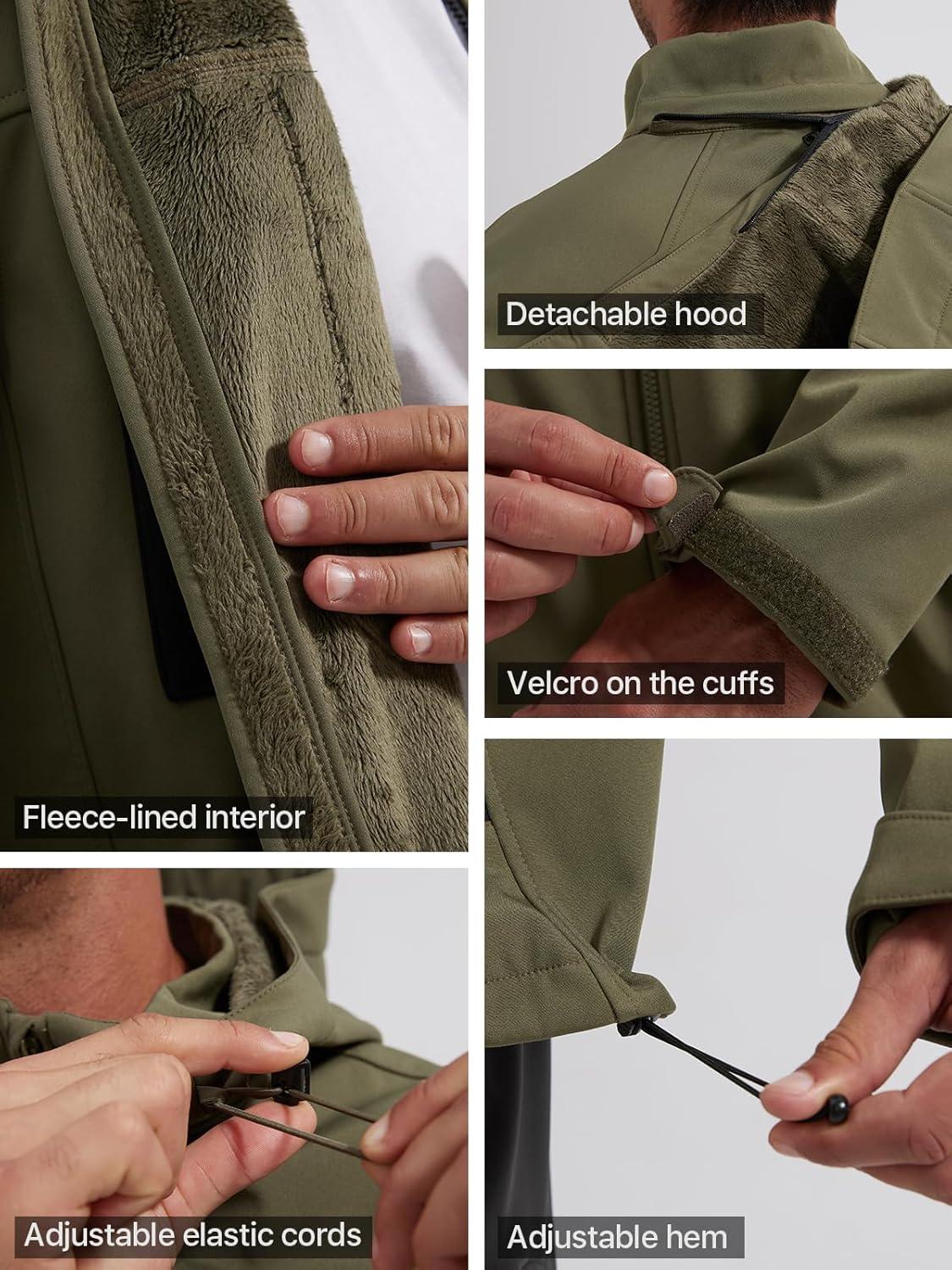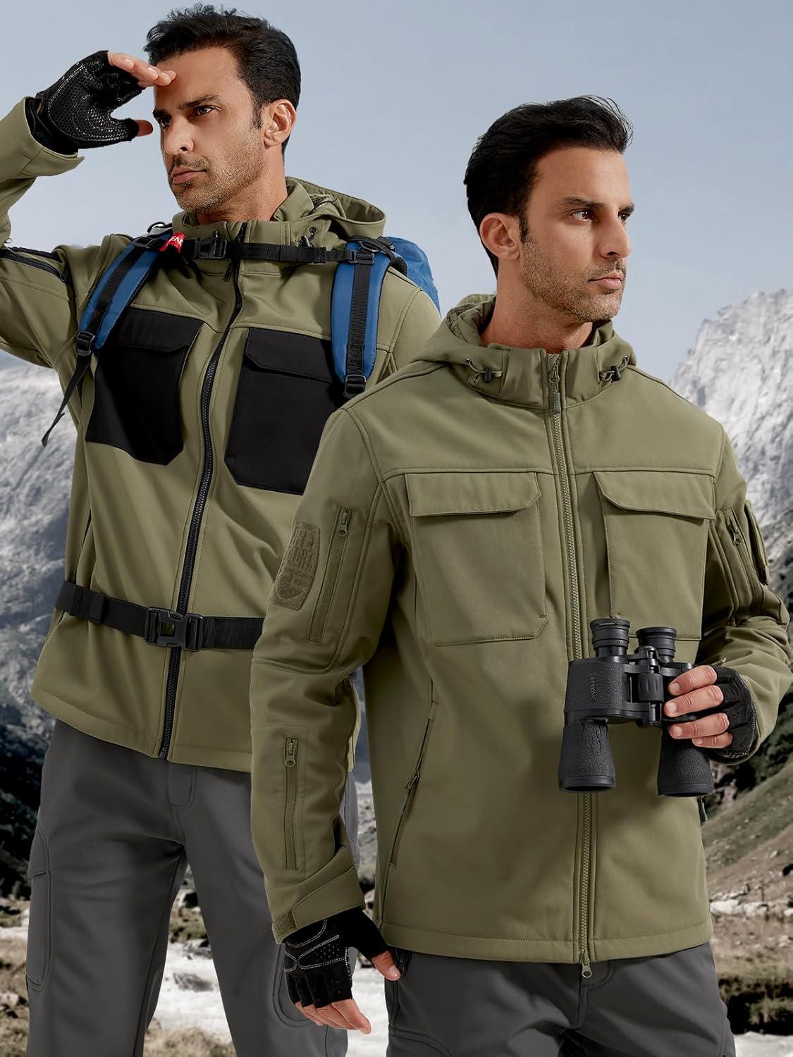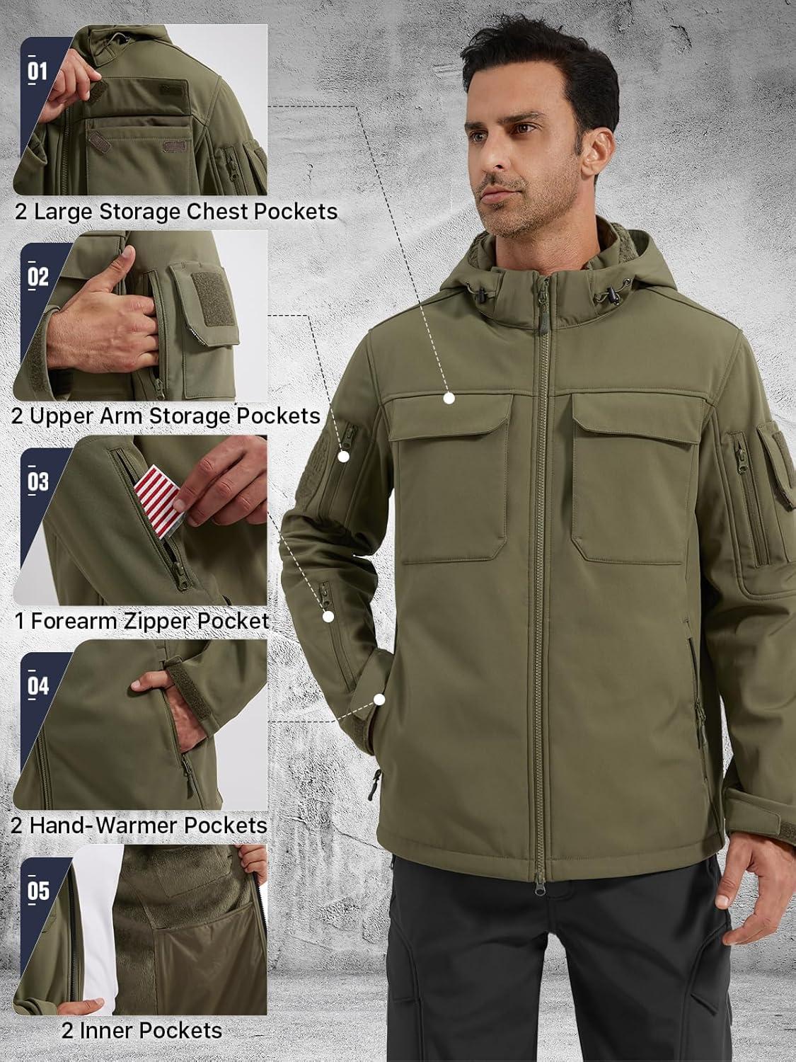 imageFREE SOLDIER Mens Waterproof Softshell Jacket Thick Fleece Lined Outdoor Jacket Tactical Military Hoodie WindbreakerGreen