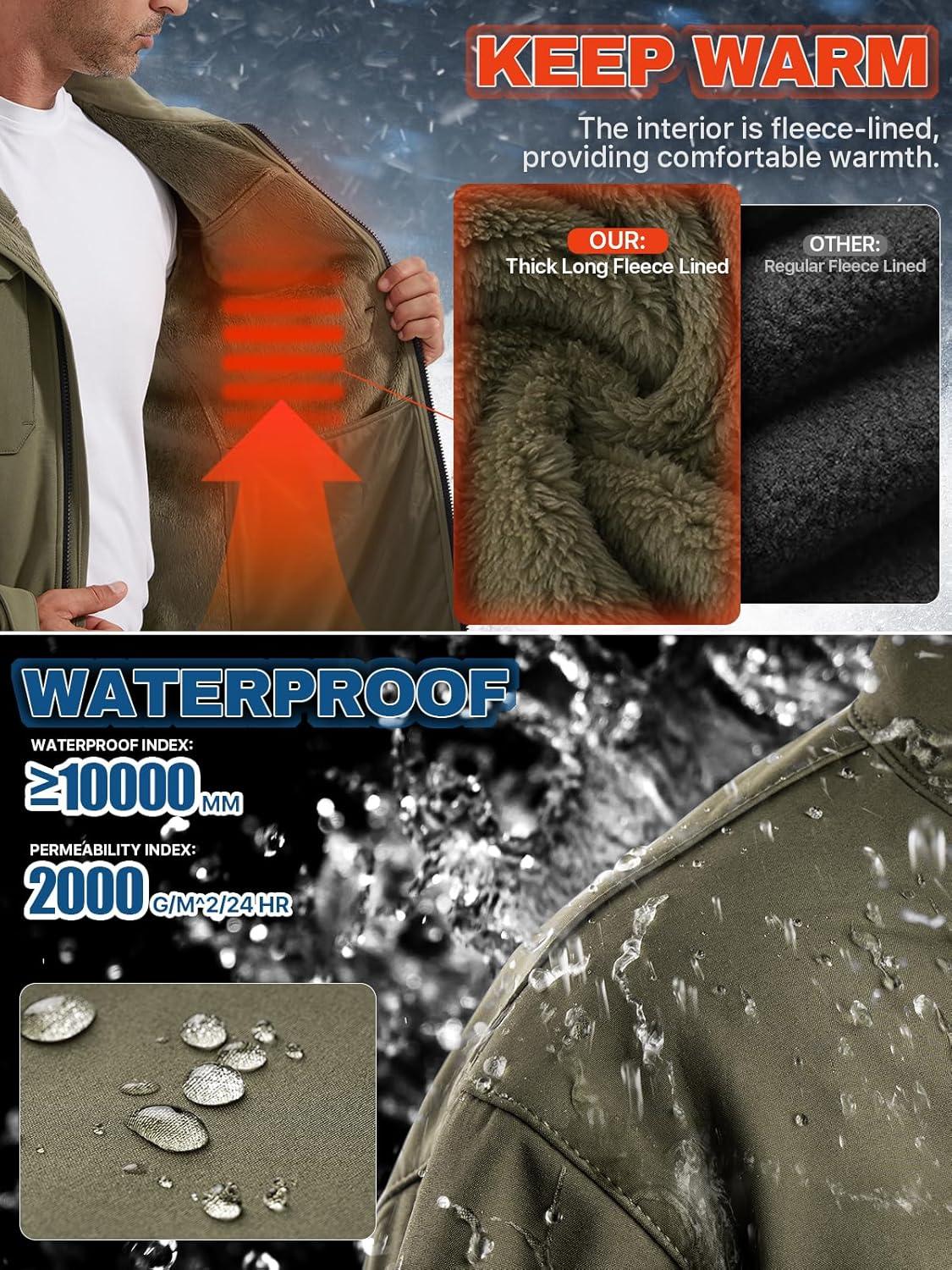 WATERPROOF&BREATHABLE: The waterproof jackets for men are made of 94% polyester and 6% Spandex waterproof material with 3-layered material, Outer durable softshell, TPU membrane mid-layer, the inner is an upgraded thick plush lining. The softshell jackets for men repels light rain, snow, moisture, making you dry and comfortable.(Waterproof Index: 8000-10000mm, Permeability Index: 2000g/m^2/24Hr)