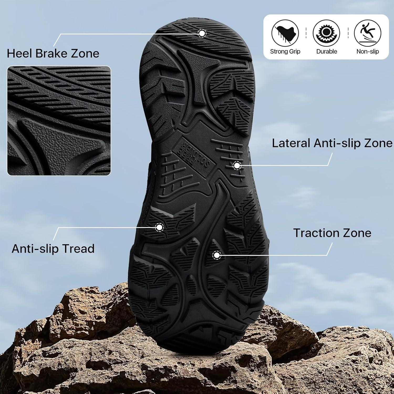 PROTECTIVE & DURABLE- This mens hiking boots upper made of plaid fabric, which is durable and anti-puncture. Body part made of TPU material, which is wear-resistant. EVA midsole, lightweight and flexible, supply excellent cushioning for work or hiking. All terrain outsole, great grip with geometrical pattern design, non-slip work boots for men. Strengthened toe cap and heel provide full protection, anti-collision and ankle support. Suit for tactical, military, combat, hunting boots