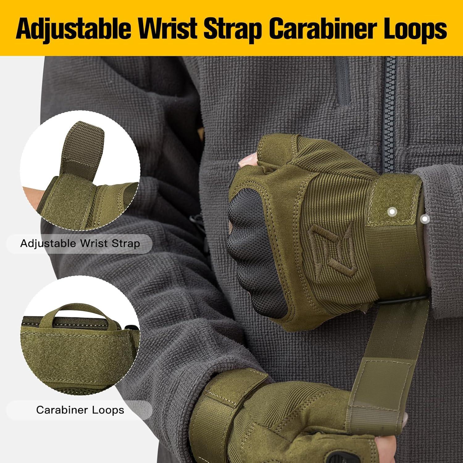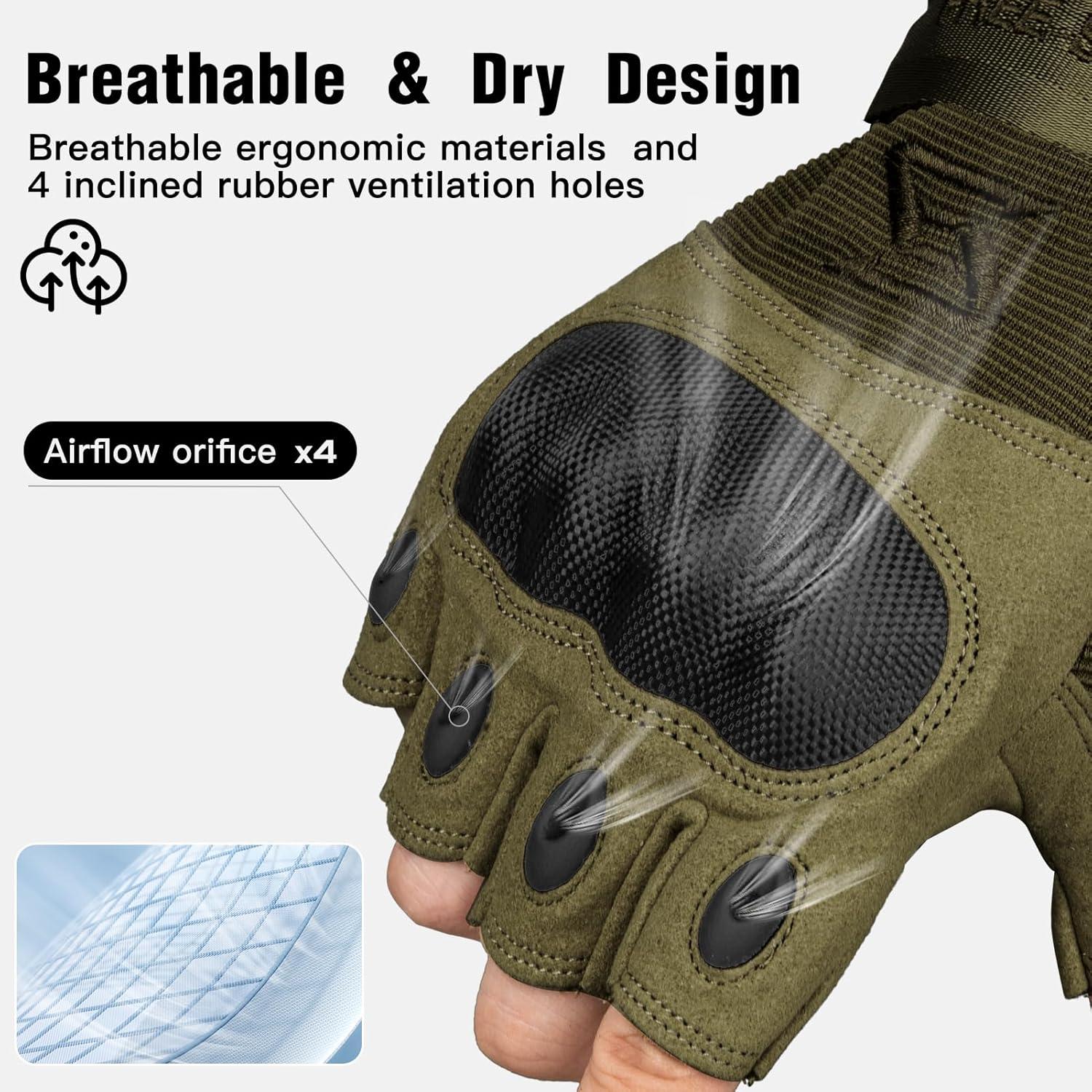 BREATHABLE & DRY DESIGN – The fingerless motorcycle gloves are made with breathable ergonomic materials and there are 4 inclined rubber ventilation holes at the finger joints to quickly dissipate heat and get rid of sweat faster, wide suitable for outdoor work sports motorcycles cycling airsoft training shooting hunting hiking camping climbing