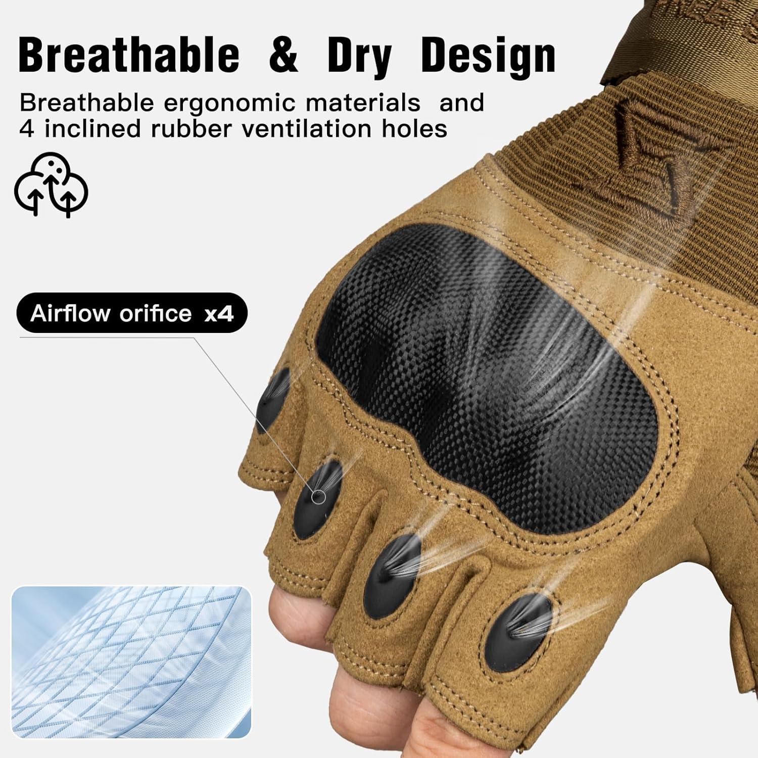 BREATHABLE & DRY DESIGN – The fingerless motorcycle gloves are made with breathable ergonomic materials and there are 4 inclined rubber ventilation holes at the finger joints to quickly dissipate heat and get rid of sweat faster, wide suitable for outdoor work sports motorcycles cycling airsoft training shooting hunting hiking camping climbing