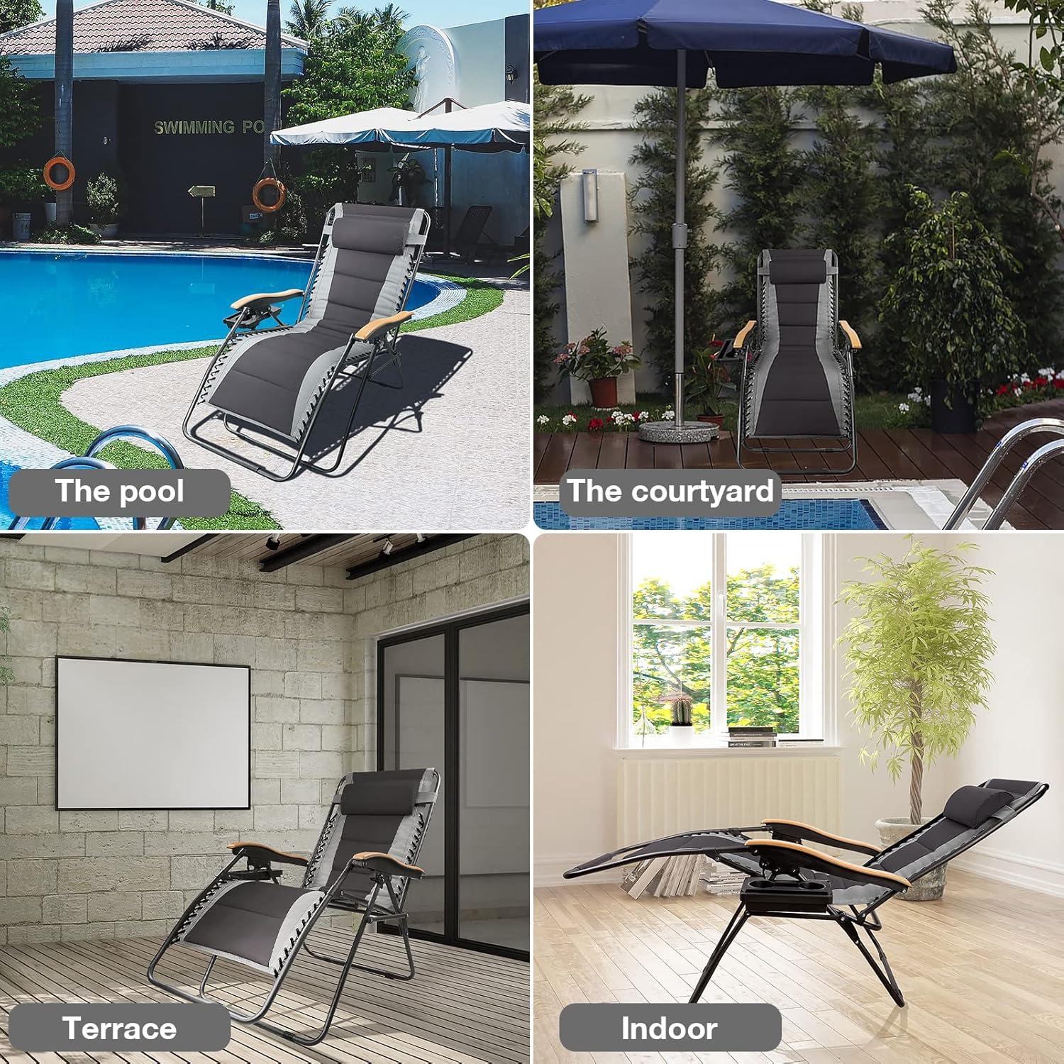 OVERSIZED SEAT: Zero Gravity Chairs built with a 400lbs capacity, and an extra-wide padded seat with weather-resistant fabric, the patio chair conforms to your body, providing both comfort and durability. The extra-large wooden pattern armrest adds an extra level of comfort for you to rest. The triangular support structure and strong bungee cords of the gravity chair ensure the long-time use