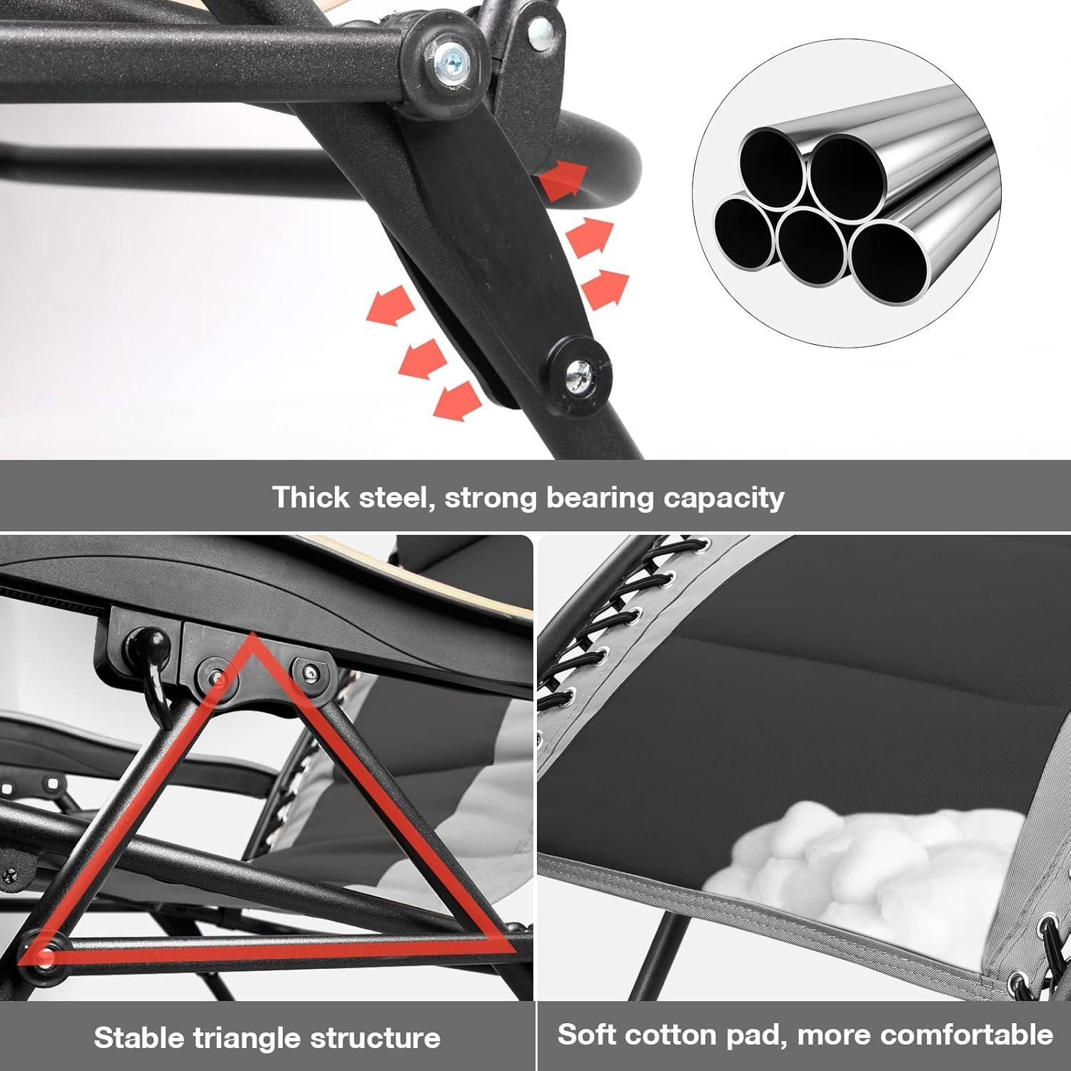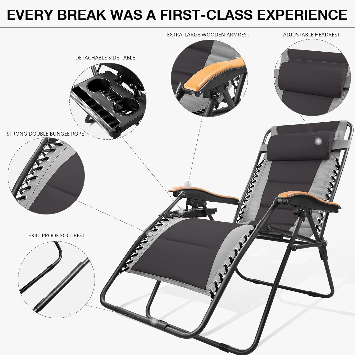 MULTIFUNCTIONAL DESIGN: The zero gravity chairs has a breathable back pad and padded seat. There are adjustable padded pillows for both headrest and lumbar support. The gravity chair xl also comes with a removable table with a cup holder for drinks, books, and phones. The side tray can be mounted on the left or right to suit your need