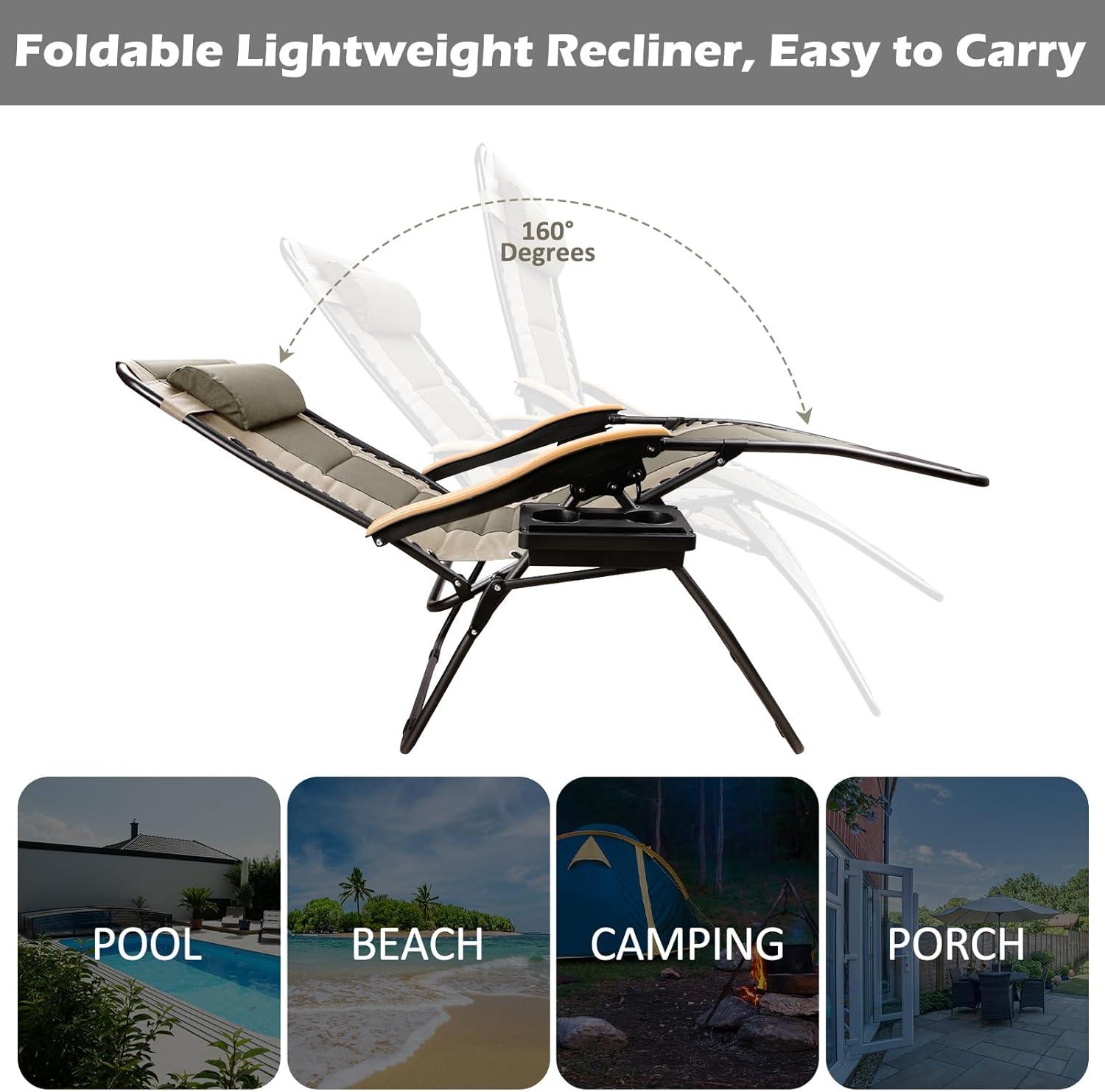 MULTIFUNCTIONAL DESIGN: The zero gravity chairs has a breathable back pad and padded seat. There are adjustable padded pillows for both headrest and lumbar support. The gravity chair xl also comes with a removable table with a cup holder for drinks, books, and phones. The side tray can be mounted on the left or right to suit your need