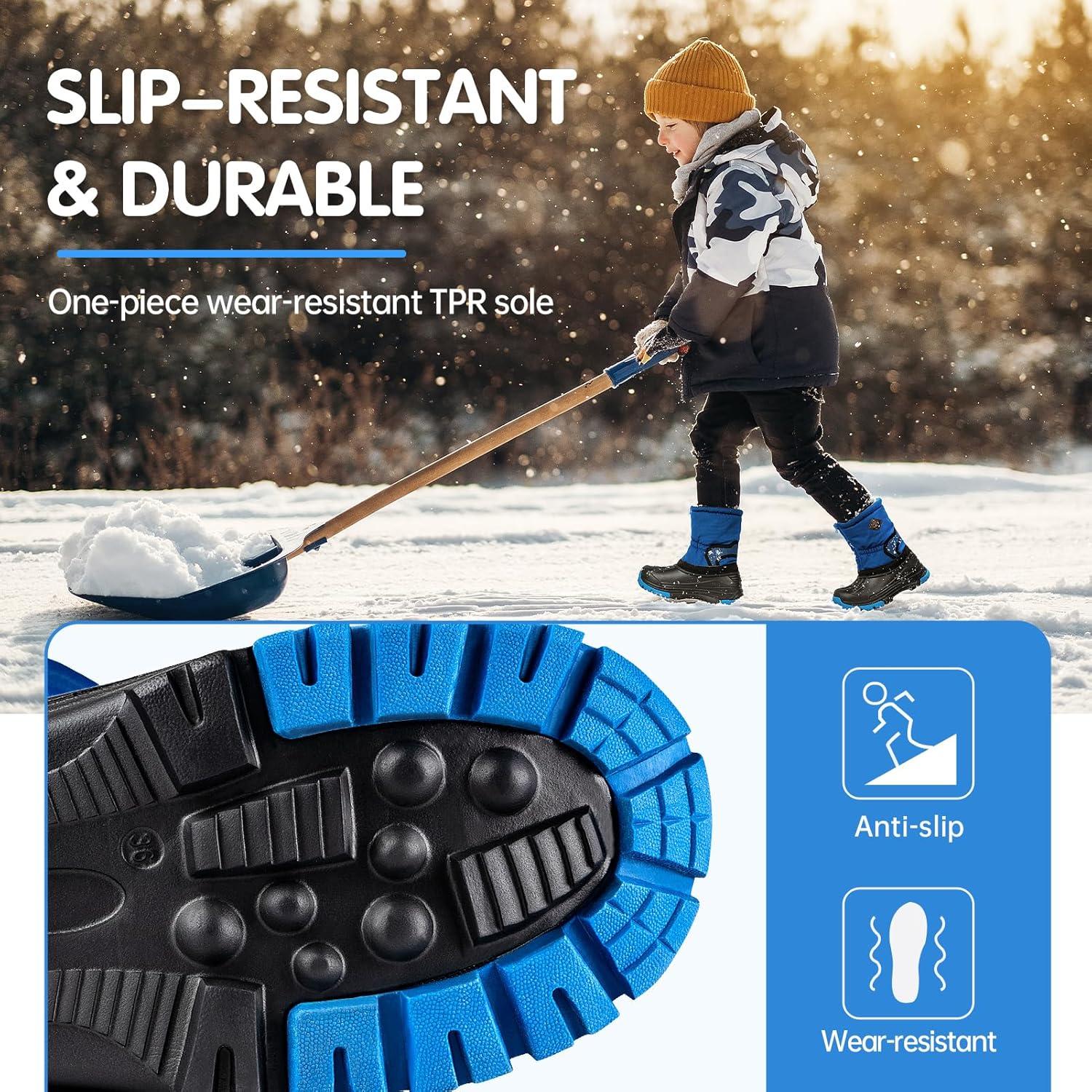 ULTRA-LIGHTWEIGHT EVA WATERPROOF SHELL:This boy's winter snow boot is made with a super-light EVA shell and nylon waterproof upper, providing double protection to easily block rain and snow. The sole is made of flexible but sturdy rubber, so it also can be used as a rain boot. The snow boots are lightweight and protective, allowing kids to run freely in snowy and damp conditions