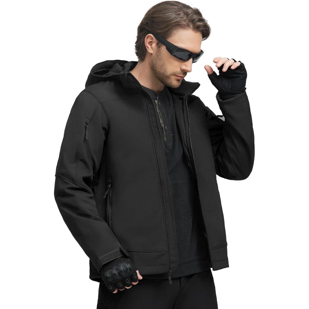 FREE SOLDIER Softshell Jackets for Men Water Resistant Fleece Lined Tactical Hunting Winter Windbreaker with Detachable Hood(Black,XL)