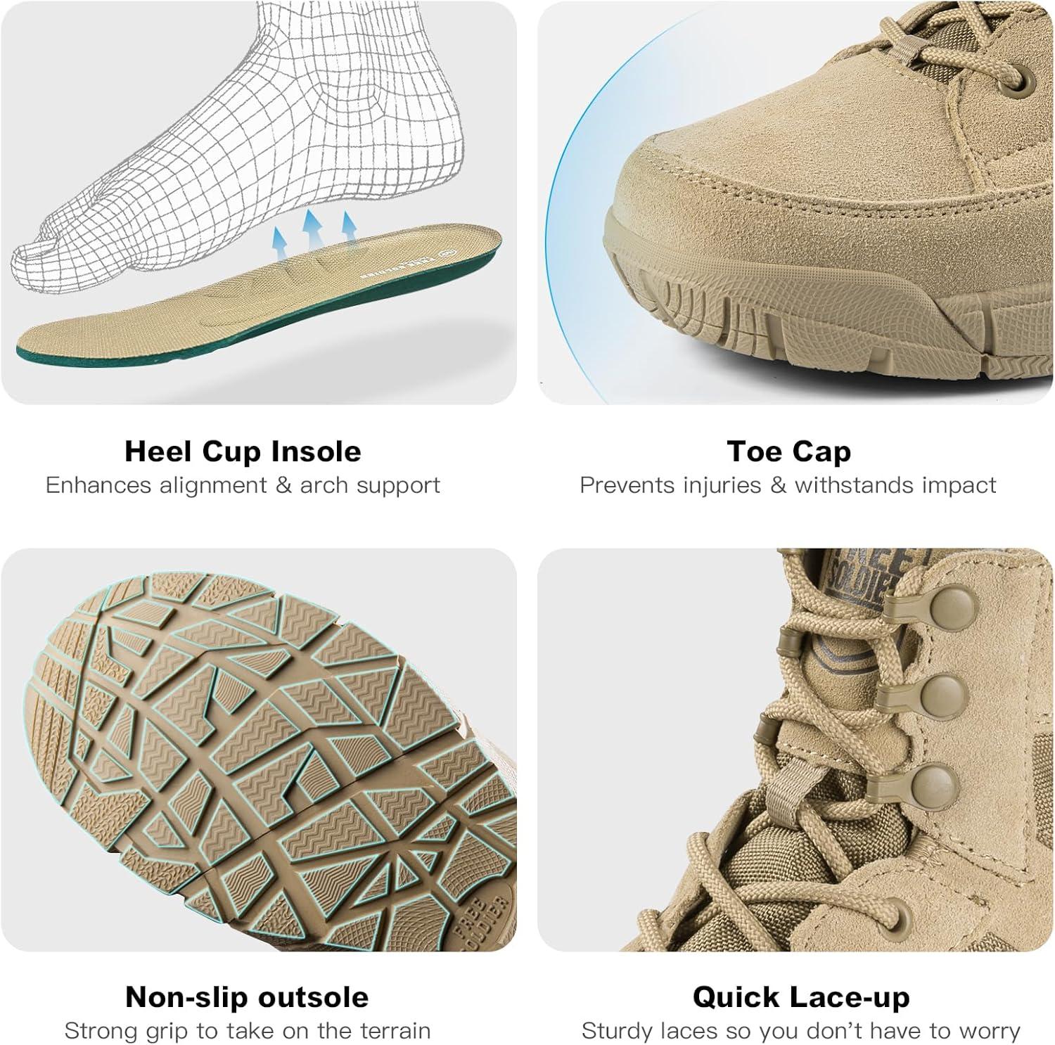 STABLE SUPPORT:Crafted with an EVA midsole,these mens work boots absorb impact to reduce foot fatigue and enhance stability with every step.They are designed for better cushioning,and high energy return.Tactical boots with removable,contoured insole offers arch support,distributing pressure evenly to reduce fatigue. Designed for flat and slightly uneven terrain,these desert boots men provide reliable support,making them a better choice for both outdoor activities and daily wear