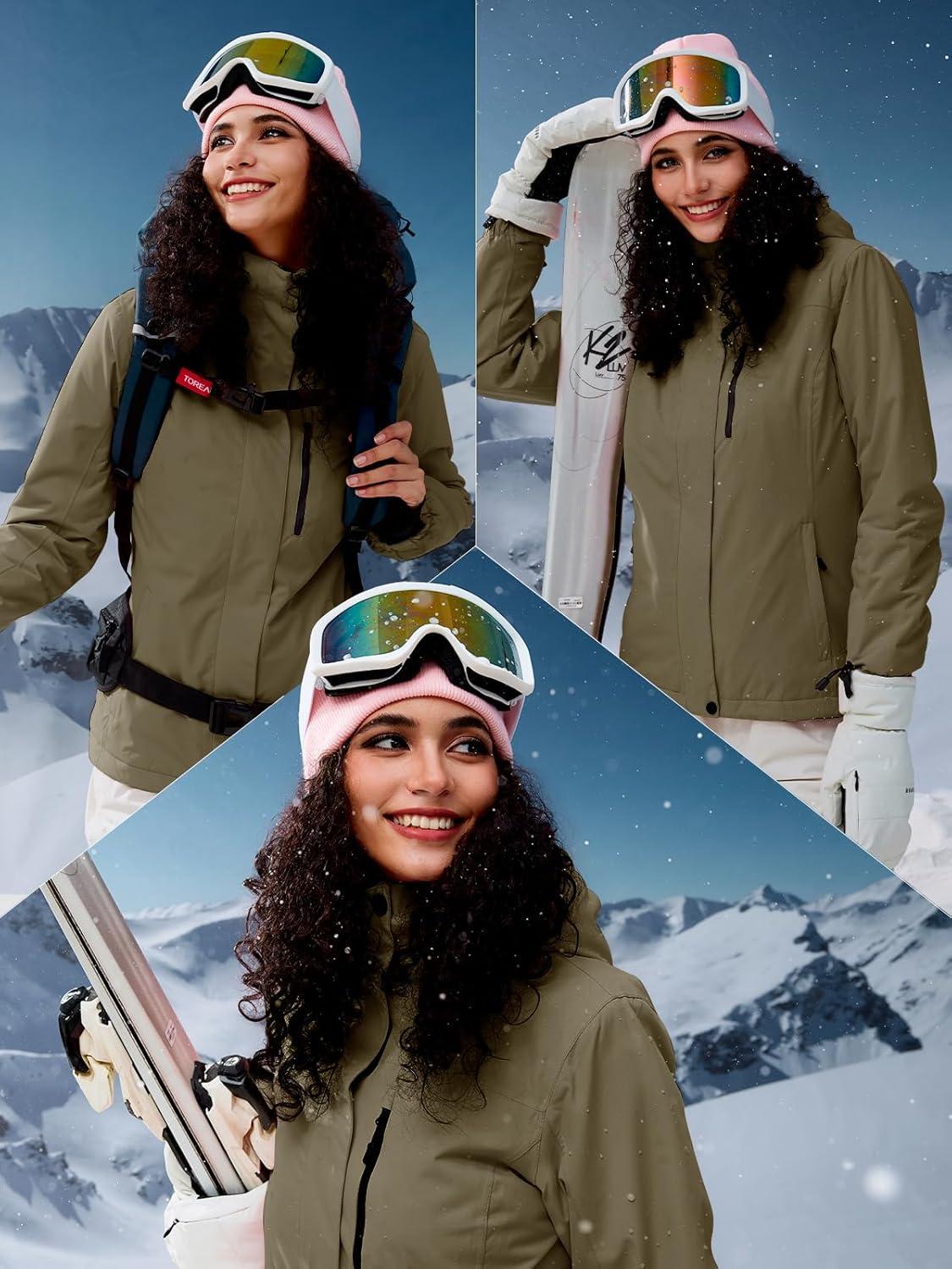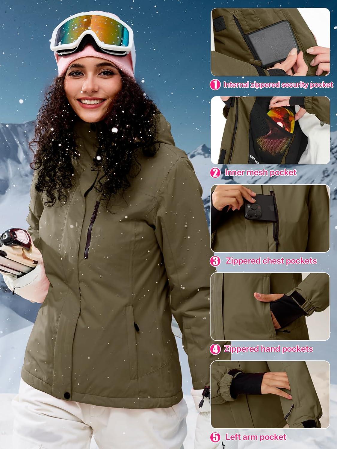 FREE SOLDIER Women's Waterproof Ski Snow Jacket Fleece Lined Warm Winter Rain Jacket with Hood Fully Taped Seams(Army Green)