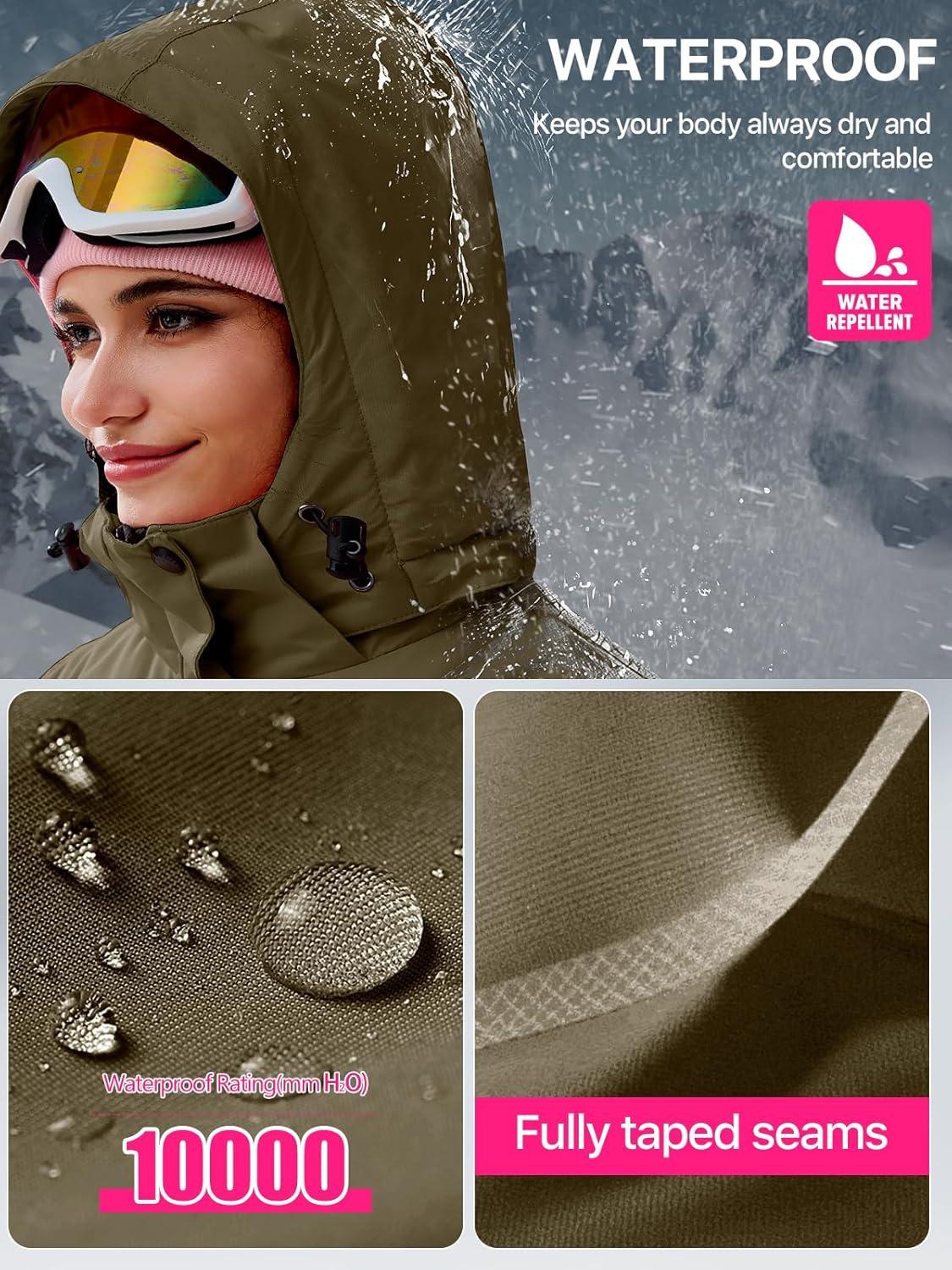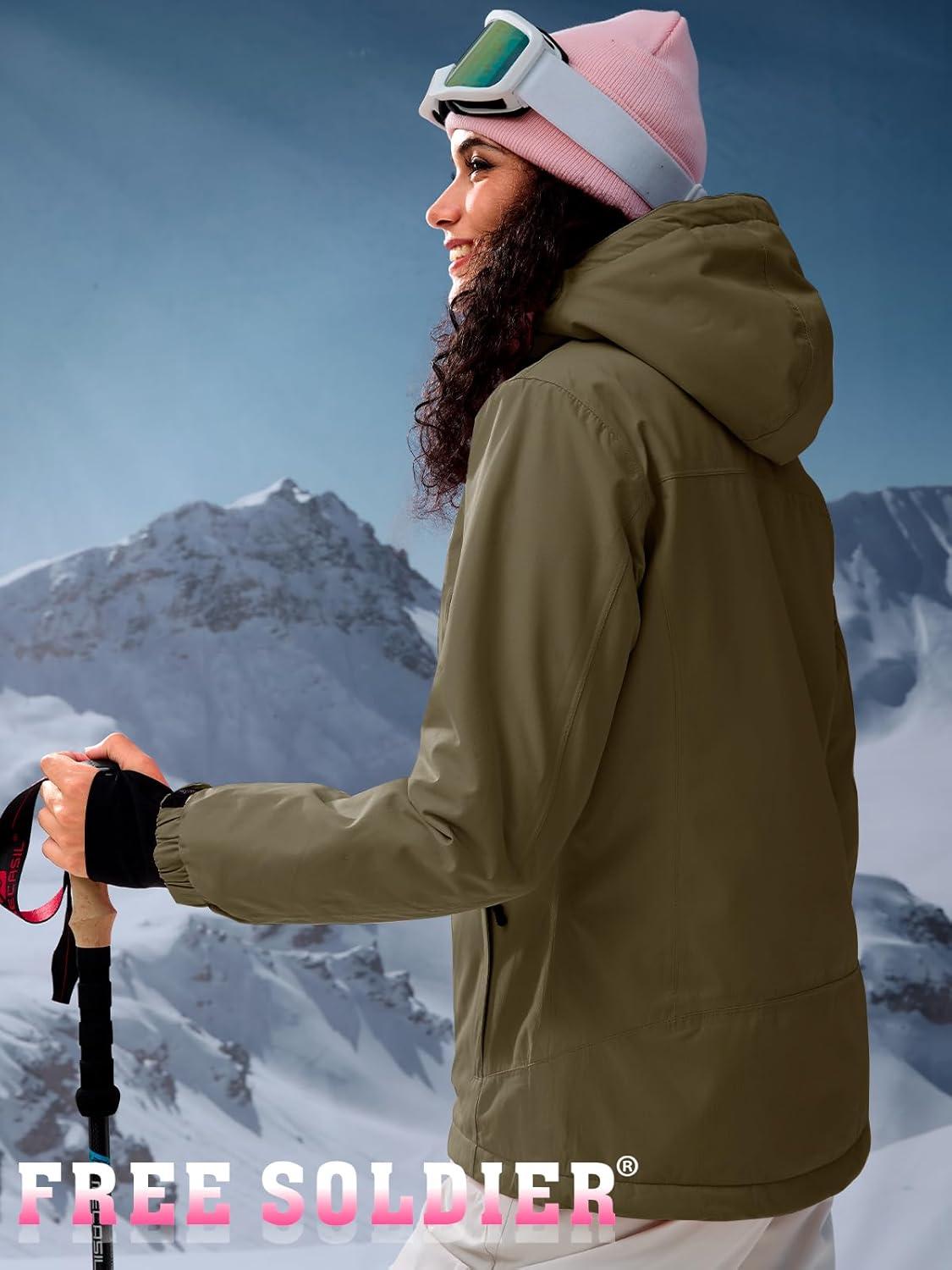 imageFREE SOLDIER Womens Waterproof Ski Snow Jacket Fleece Lined Warm Winter Rain Jacket with Hood Fully Taped SeamsArmy Green